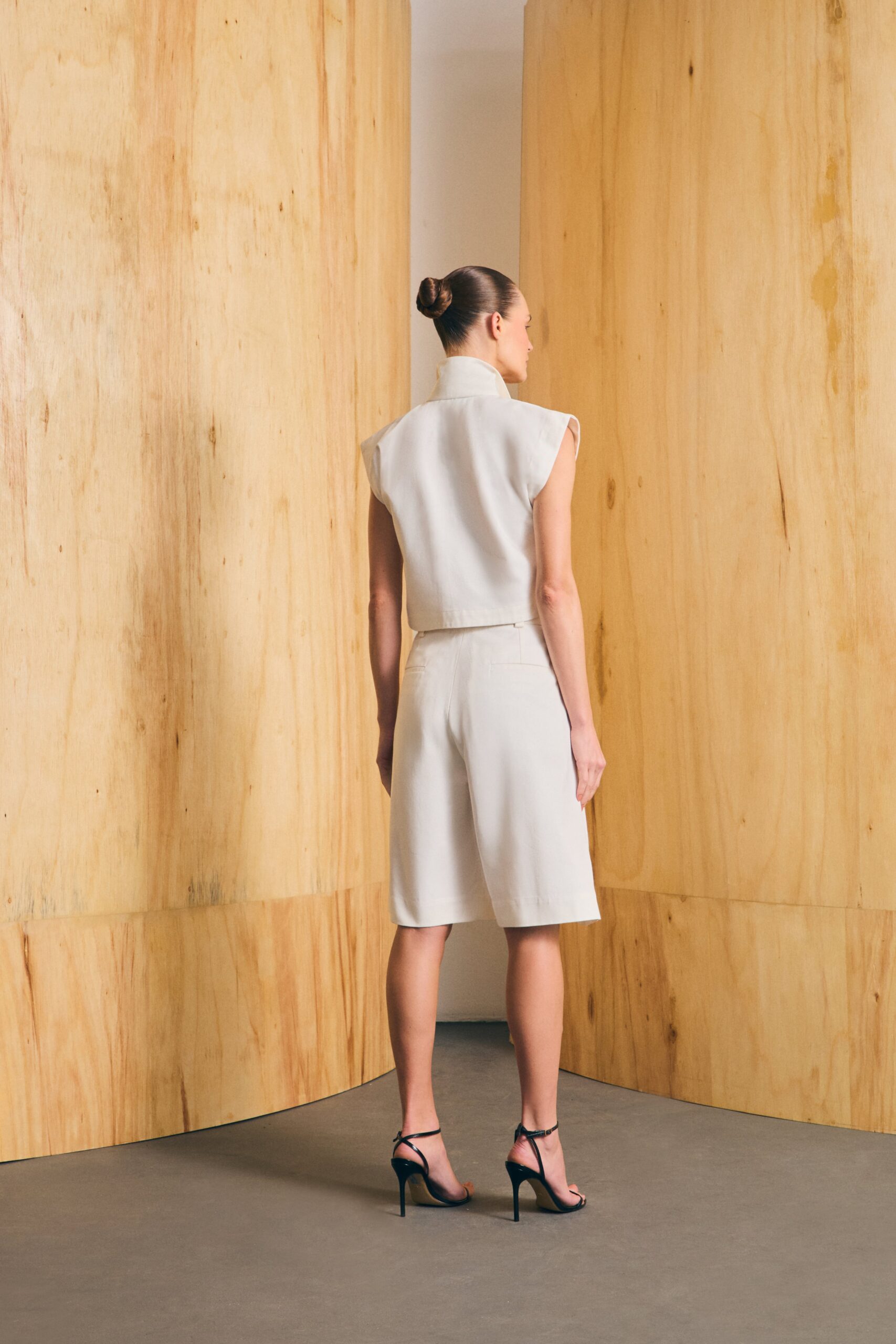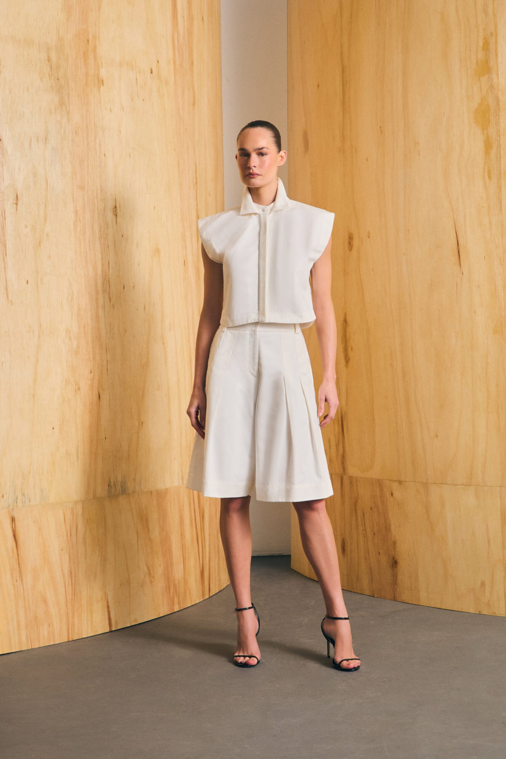 Minimalismo e presença em uma só peça. A blusa estruturada off-white foi criada para mulheres que buscam sofisticação com um toque contemporâneo. Com modelagem reta e ombros marcantes, valoriza a silhueta de forma imponente e atual. O acabamento limpo e o fechamento frontal embutido reforçam a estética depurada da peça — perfeita para composições modernas, monocromáticas ou em contraste com estampas. Uma peça versátil, pensada para protagonizar looks elegantes em diferentes ocasiões.