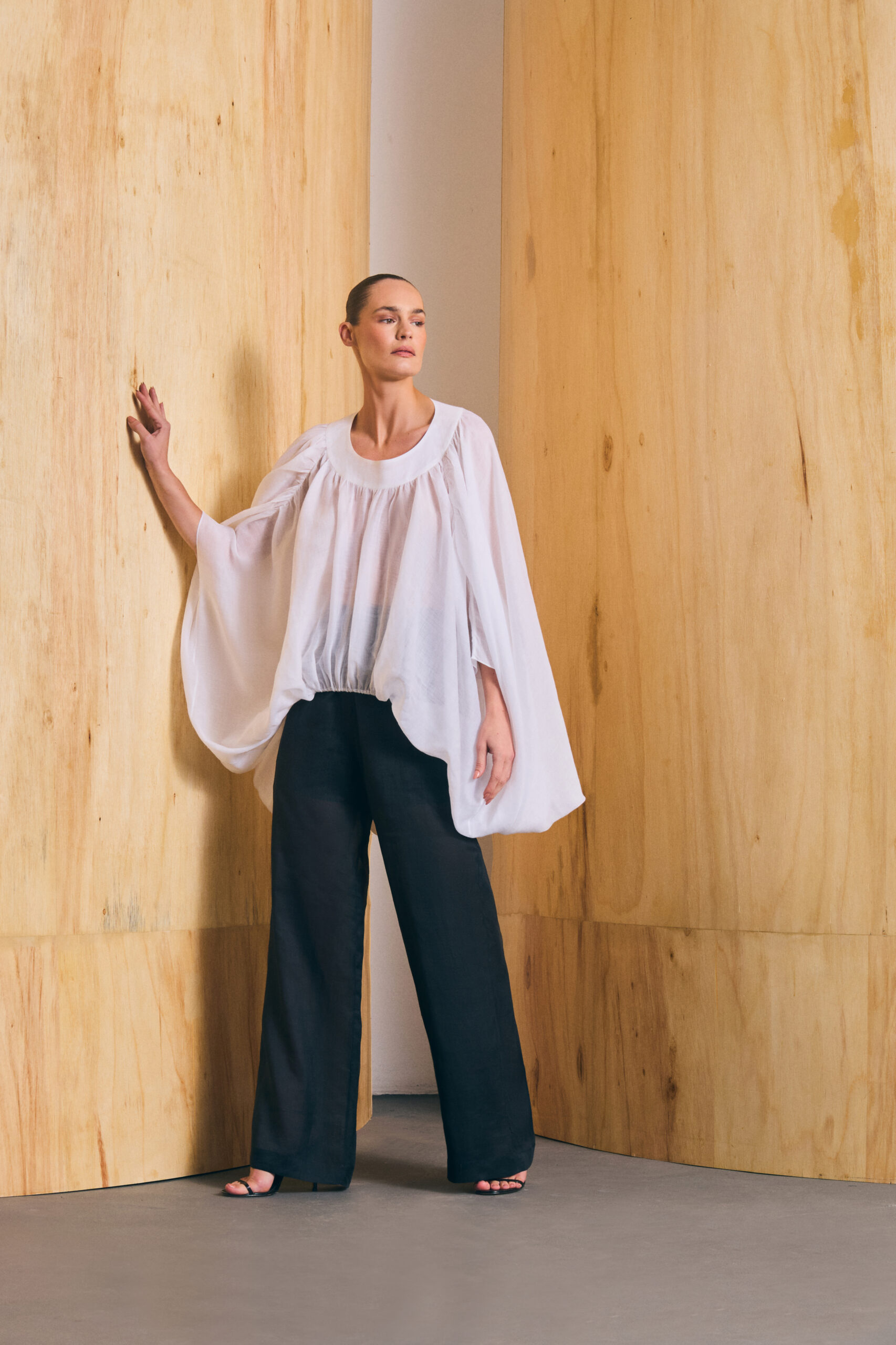 As mangas amplas em formato capa e o caimento leve do tecido geram movimento sutil, enquanto a barra com elástico embutido define a base da peça com equilíbrio. O decote redondo com acabamento limpo reforça a estética refinada.