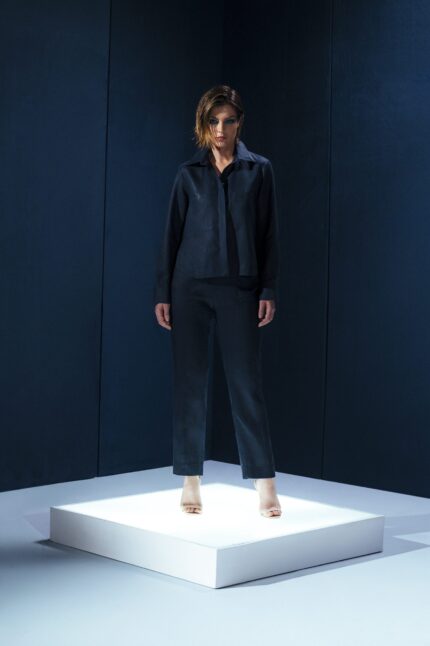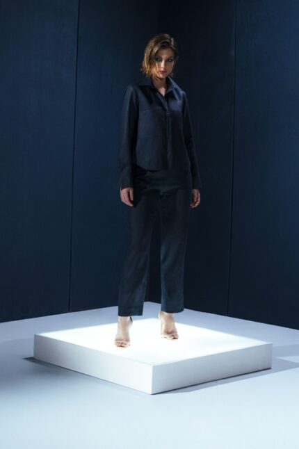 Calça jeans reta em 100% algodão, com cintura alta e pregas frontais estrategicamente posicionadas. O detalhe das pregas adiciona sofisticação ao design sem criar volume, mantendo a silhueta limpa e elegante. A peça tem um corte minimalista, sem bolsos aparentes, ideal para composições que exigem equilíbrio entre casualidade e sofisticação. Versátil, transita bem entre ambientes urbanos e produções mais refinadas.