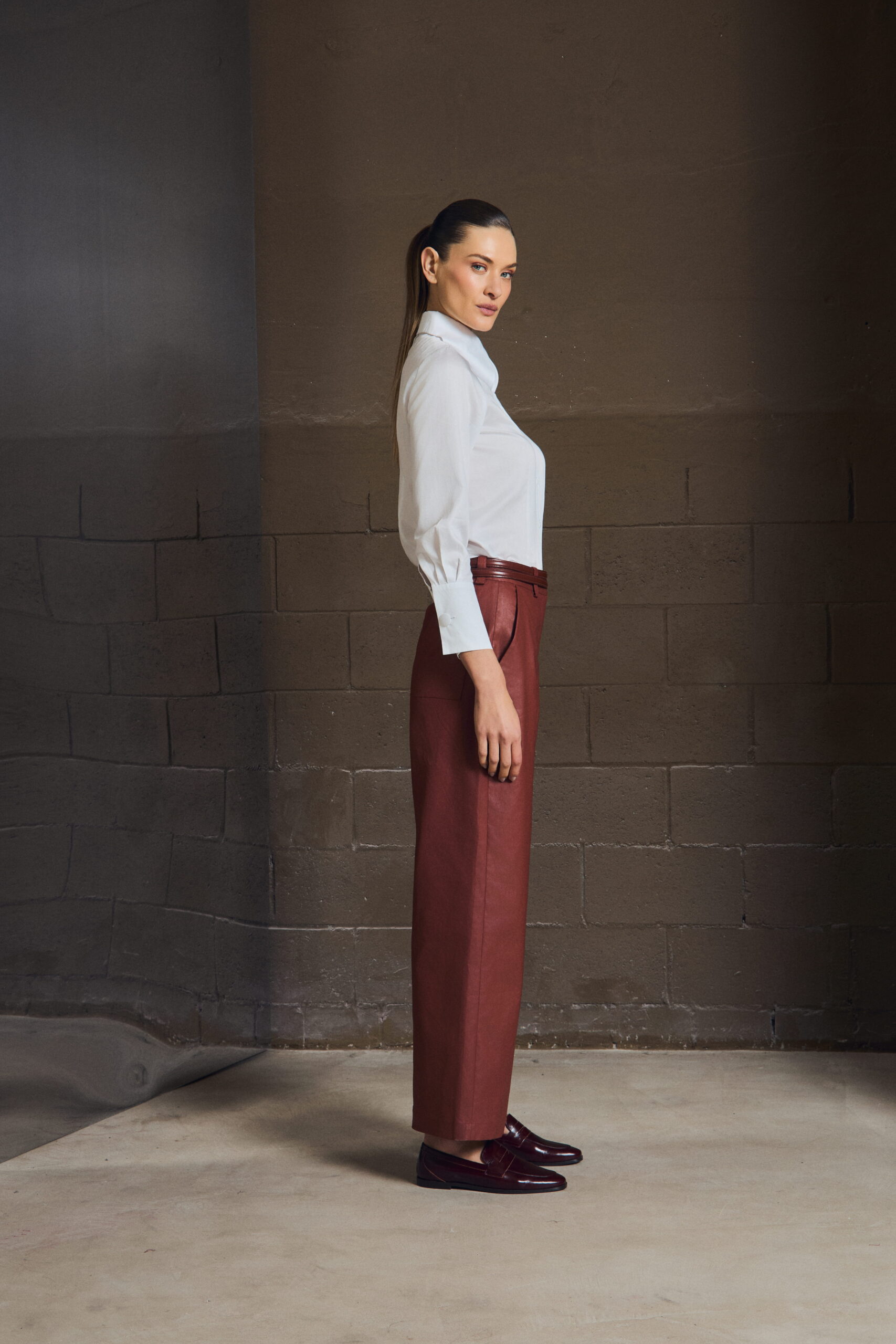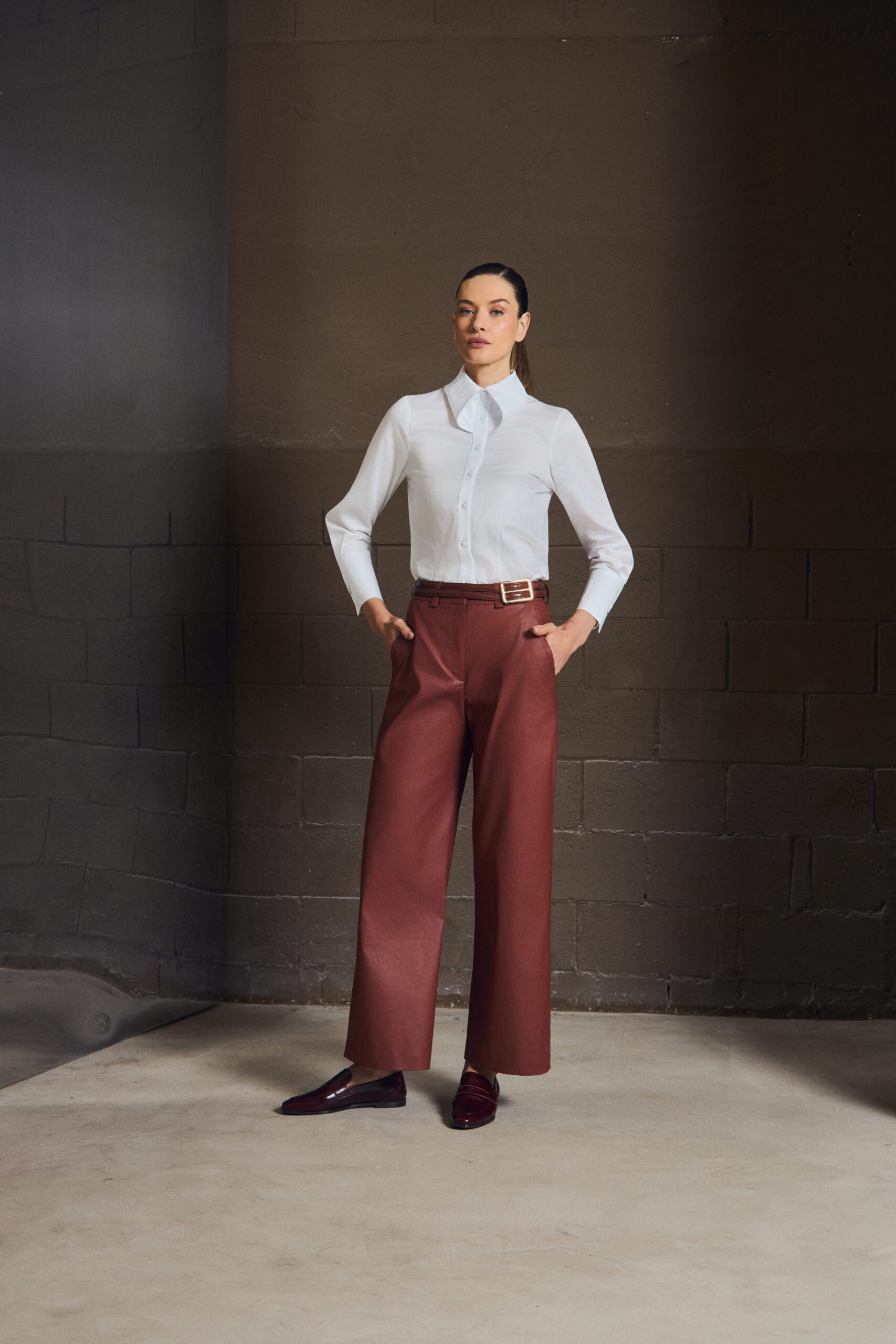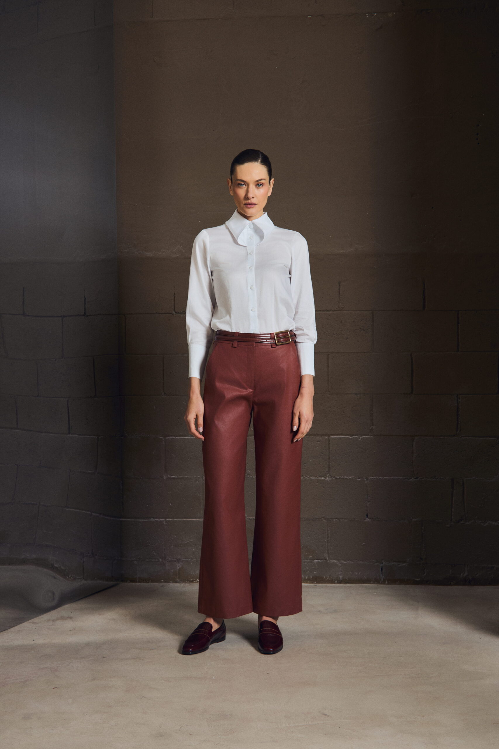 A calça reta em sarja resinada equilibra estrutura e conforto. O caimento preciso alonga a silhueta, enquanto o toque leve garante mobilidade — uma base essencial para composições modernas.