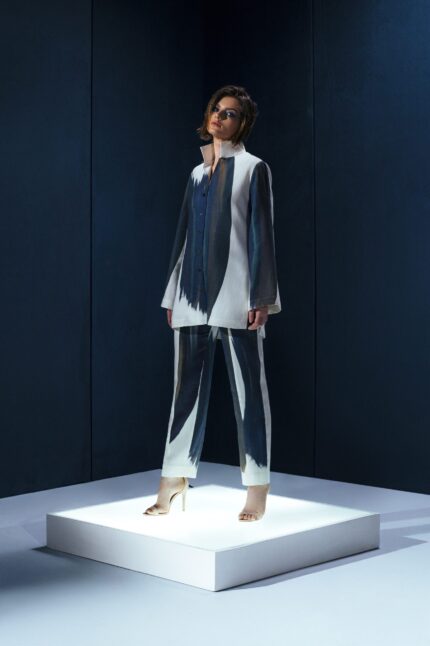 A calça propõe um contraste sofisticado entre estrutura e leveza, combinando o corpo em gorgurão com barra em organza de seda. De corte amplo e reto, valoriza o movimento e garante conforto, enquanto os recortes em organza trazem sofisticação e leve transparência, criando um ponto focal elegante no look. A união desses dois tecidos reforça a identidade da marca, que aposta em texturas naturais e detalhes refinados.