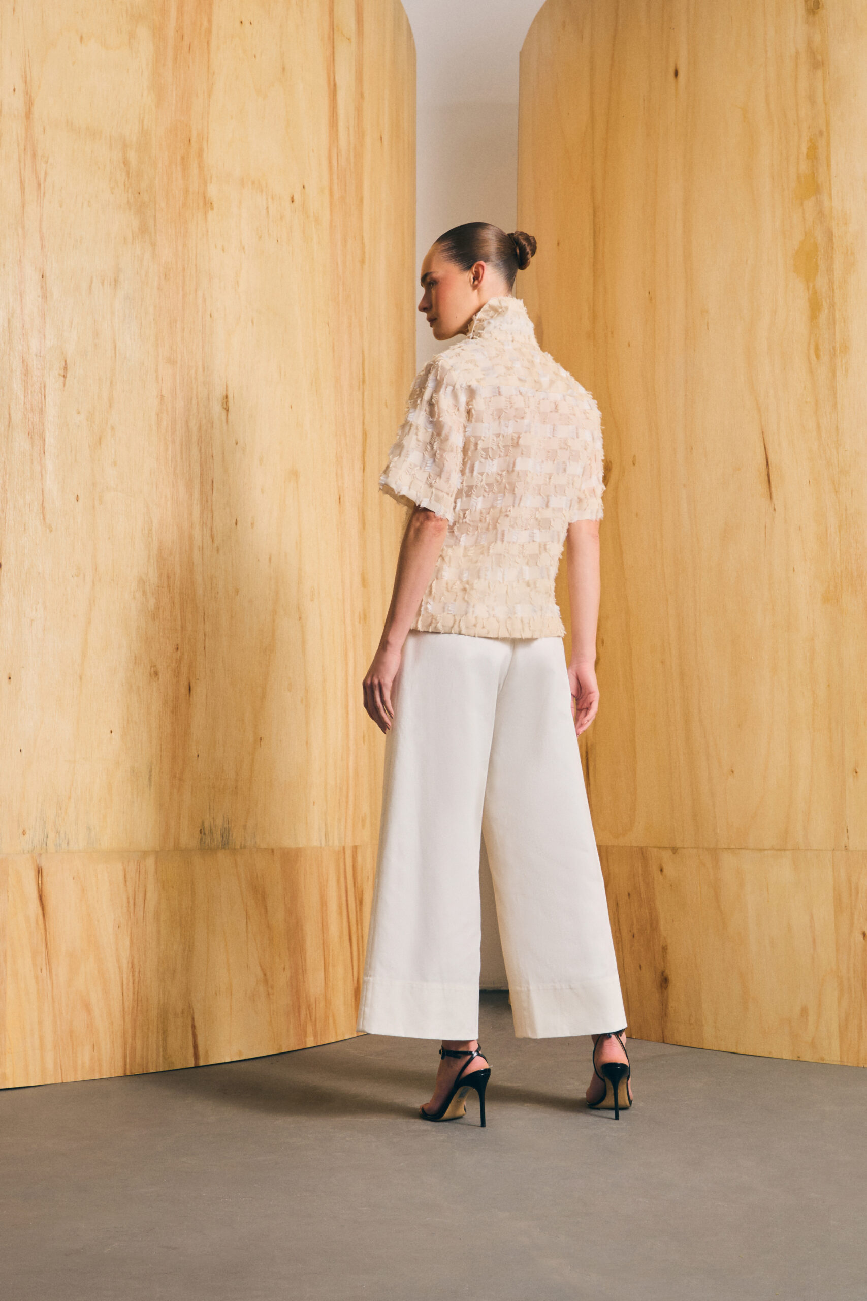 A calça em sarja off-white da Aline Rocha apresenta uma modelagem reta e sofisticada, com cintura alta e recorte limpo que valoriza a silhueta de forma discreta e moderna. Seu acabamento preciso e a estrutura do tecido garantem um caimento impecável, trazendo versatilidade para composições formais ou descomplicadas. A ausência de detalhes visíveis reforça a elegância minimalista da peça, enquanto o comprimento mais curto e a barra larga proporcionam um toque contemporâneo. Uma peça essencial que transita com facilidade entre ambientes profissionais e ocasiões especiais.
