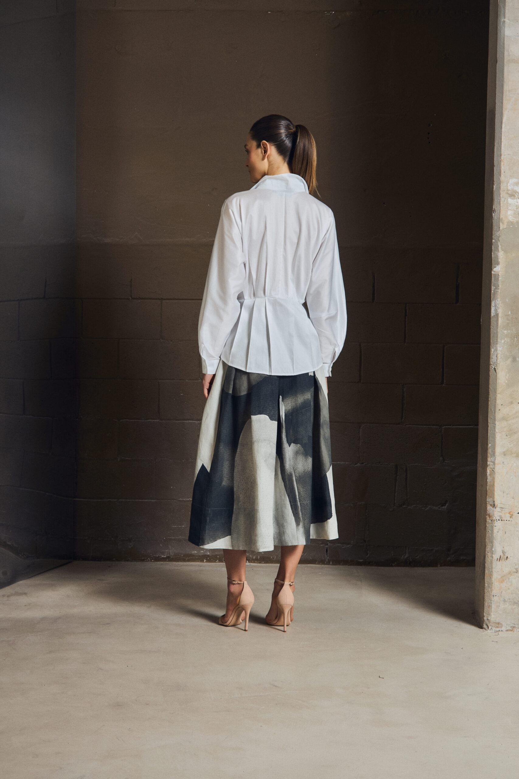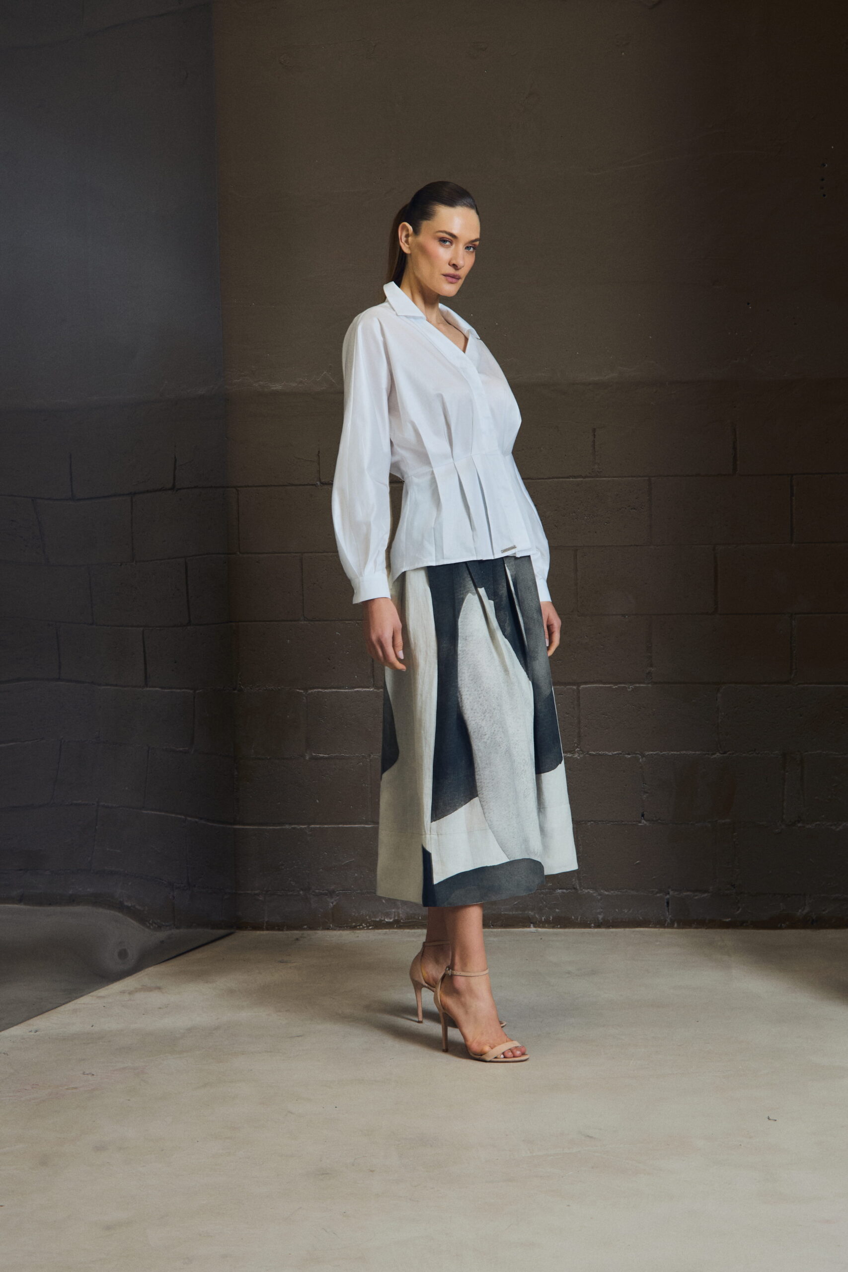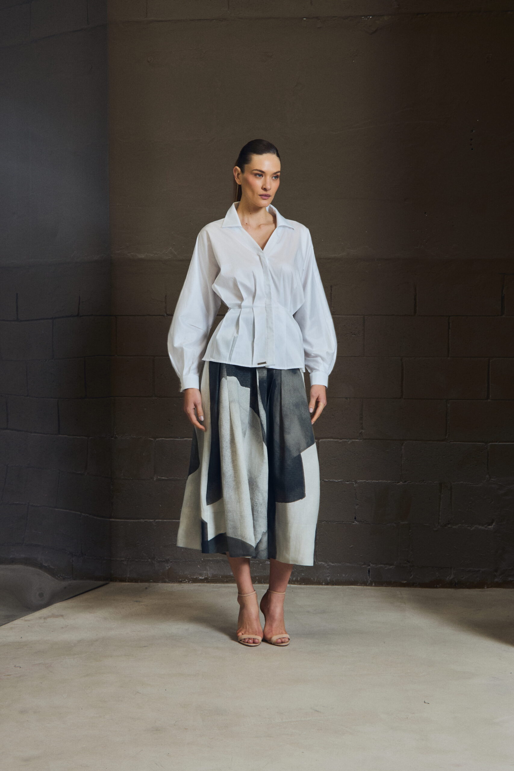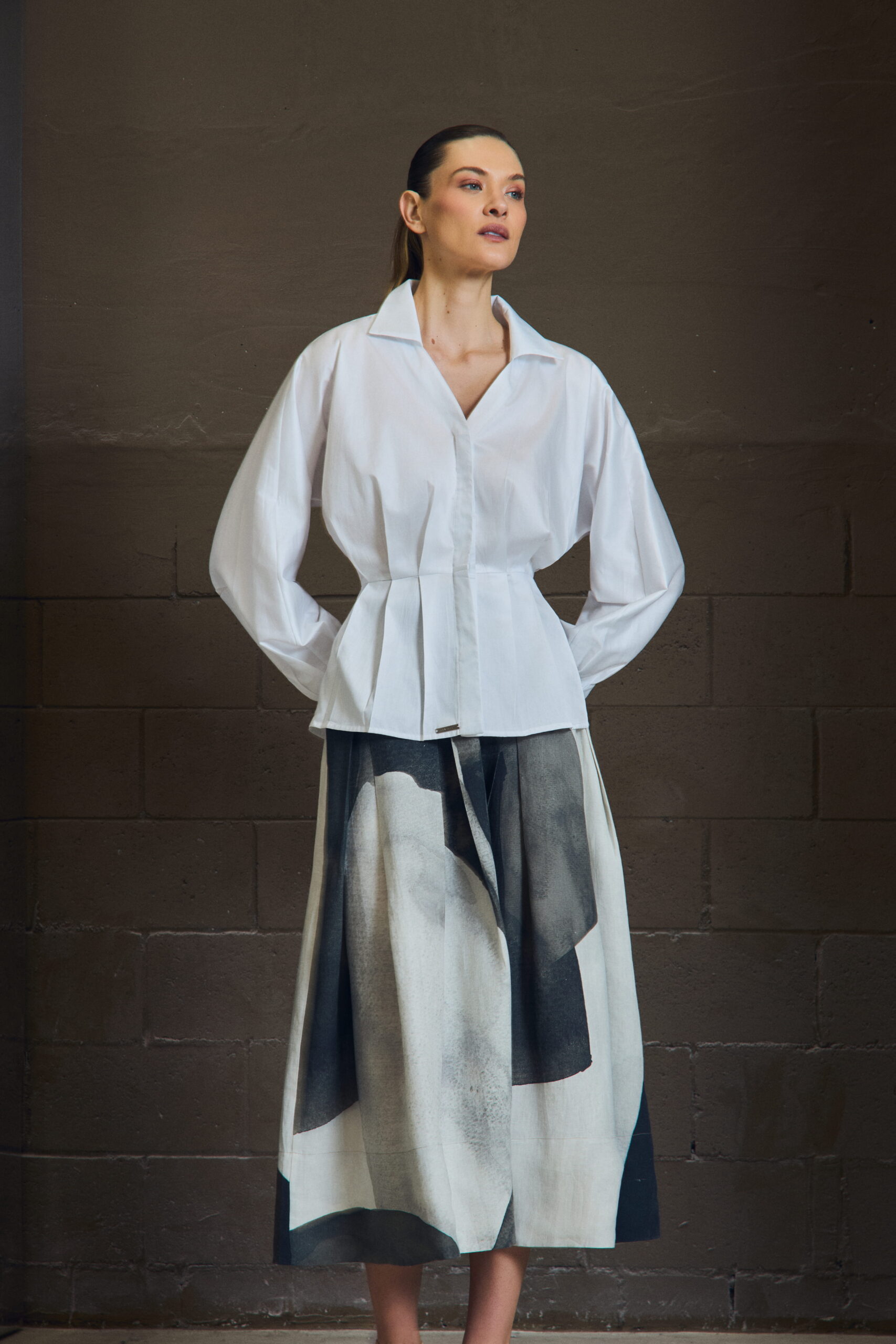 A camisa em tricoline 100% algodão traz construção com pregas frontais que criam leve marcação de cintura, equilibrando volume e precisão. A gola aberta amplia o colo, enquanto as mangas longas com leve volume reforçam a sofisticação da peça.