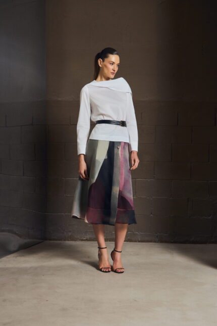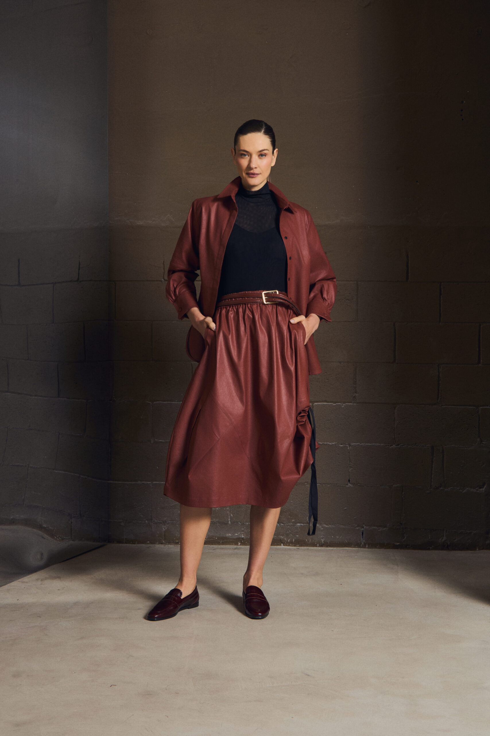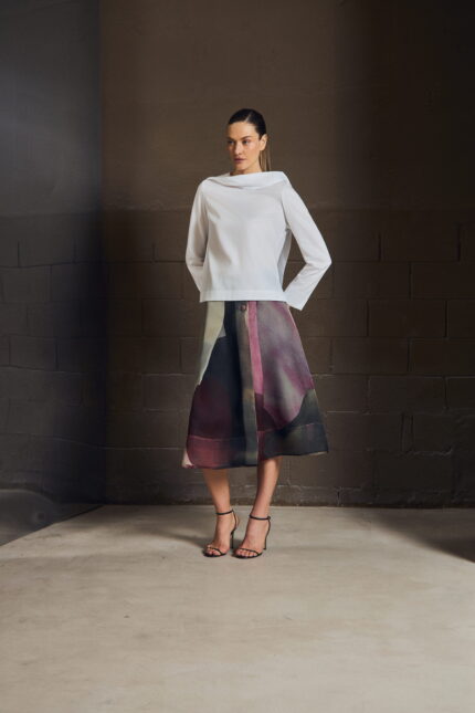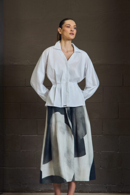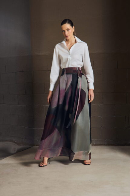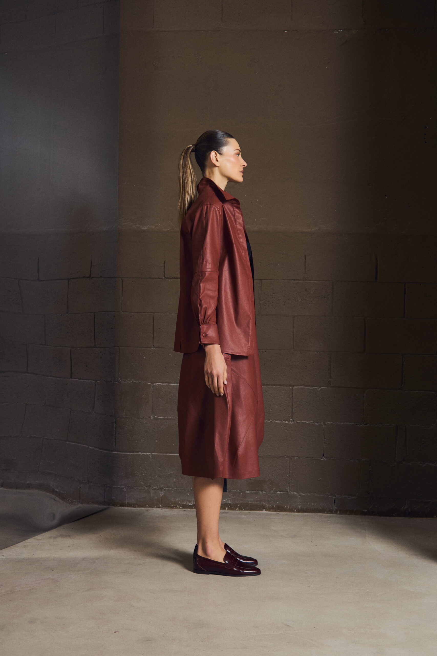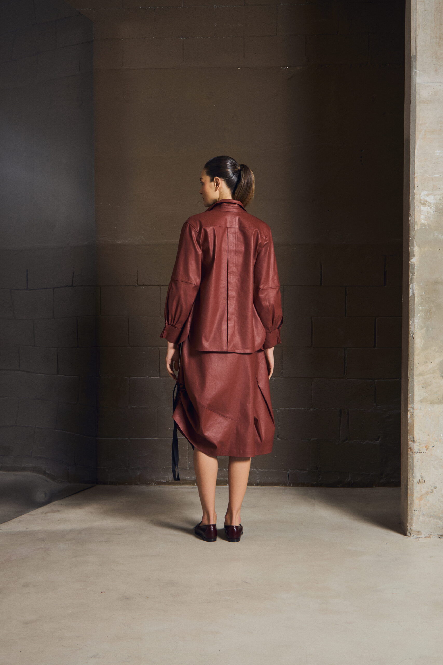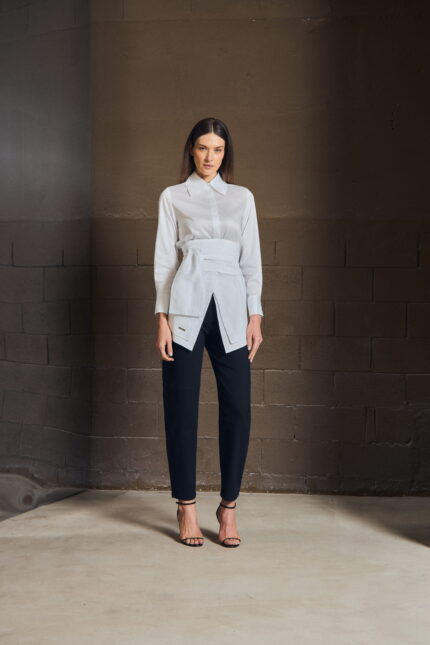 A camisa em sarja resinada revisita a alfaiataria com um olhar contemporâneo. O punho duplo reforça a presença da peça, enquanto o tecido traz o contraste entre aparência estruturada e toque leve.