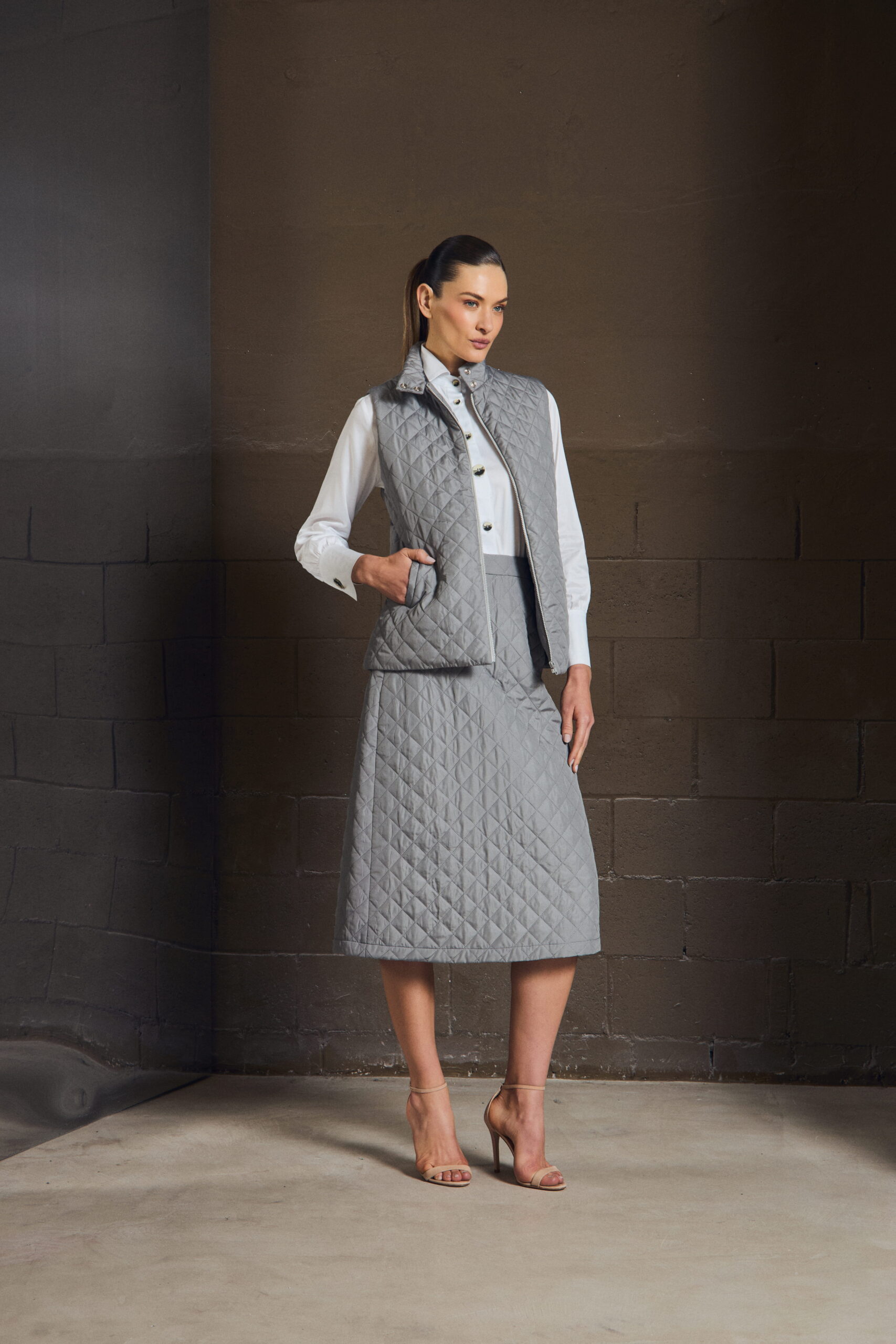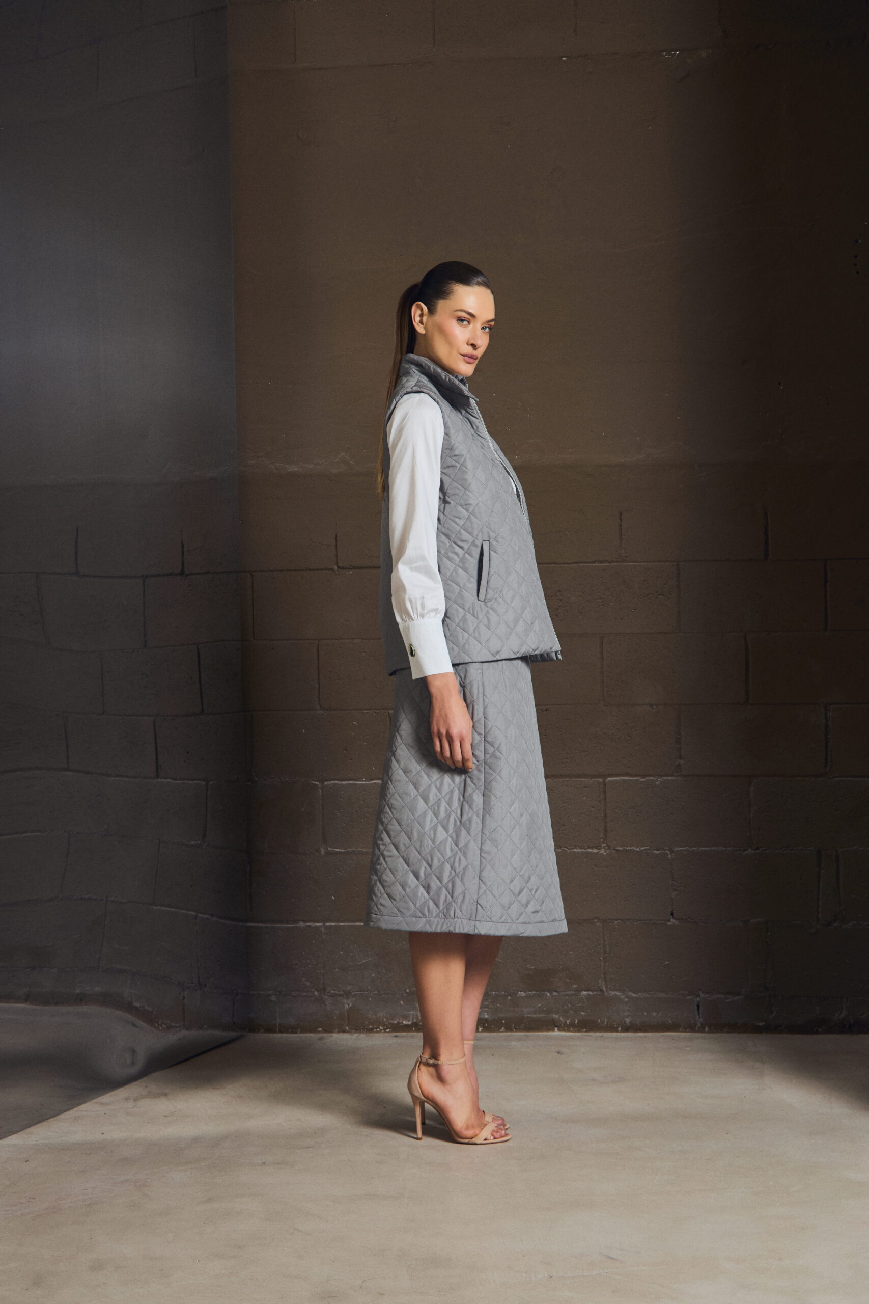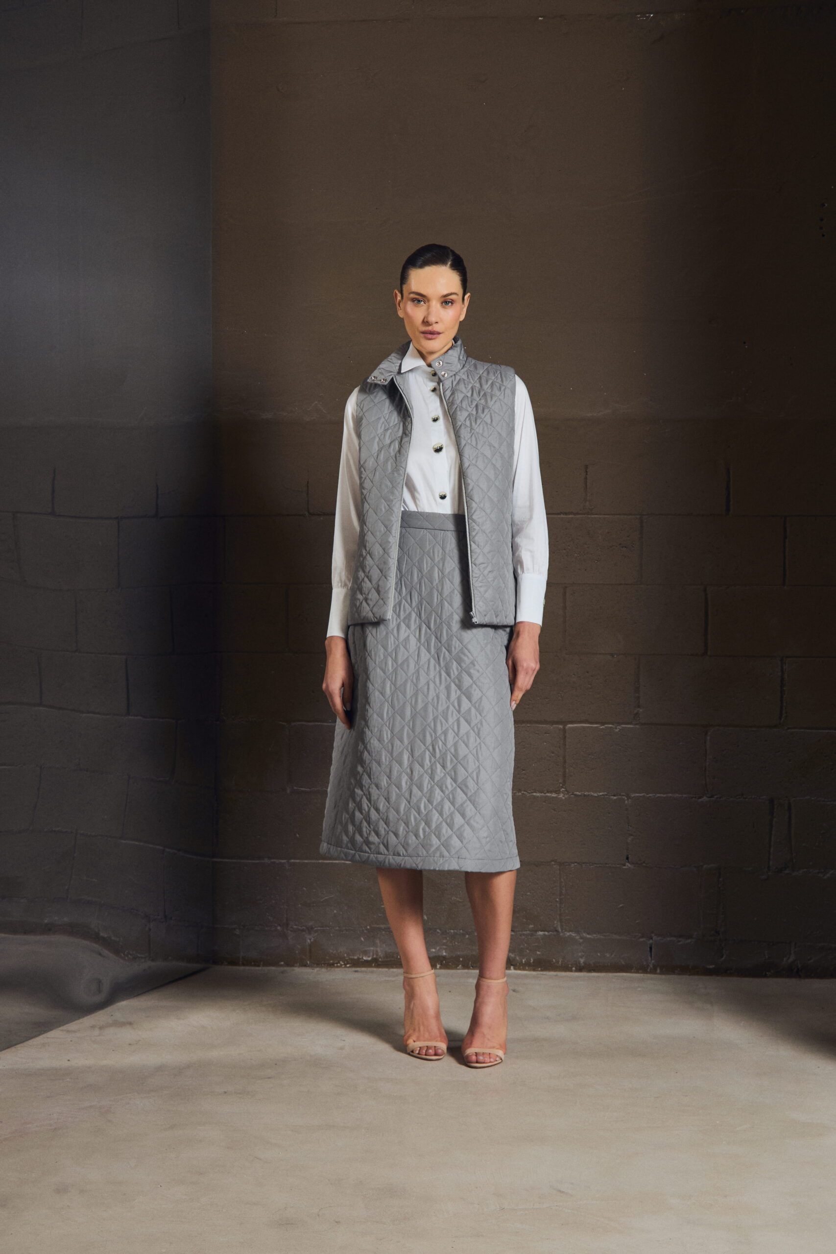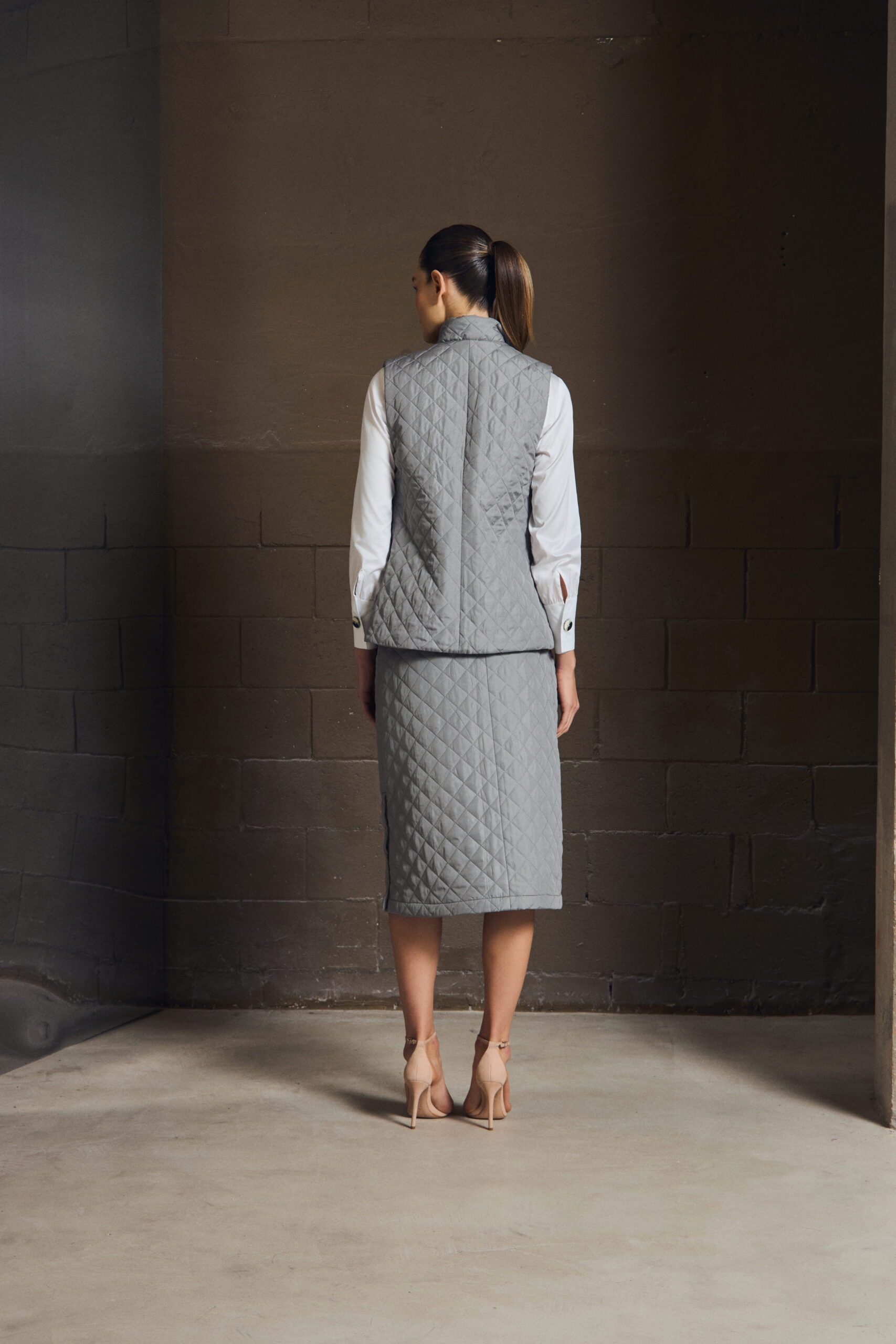 O colete em matelassê traz textura e definição ao look, criando contraste com peças mais leves. Sua construção limpa permite sobreposições elegantes, enquanto o acabamento revela um cuidado silencioso — daqueles que só se percebem ao vestir.