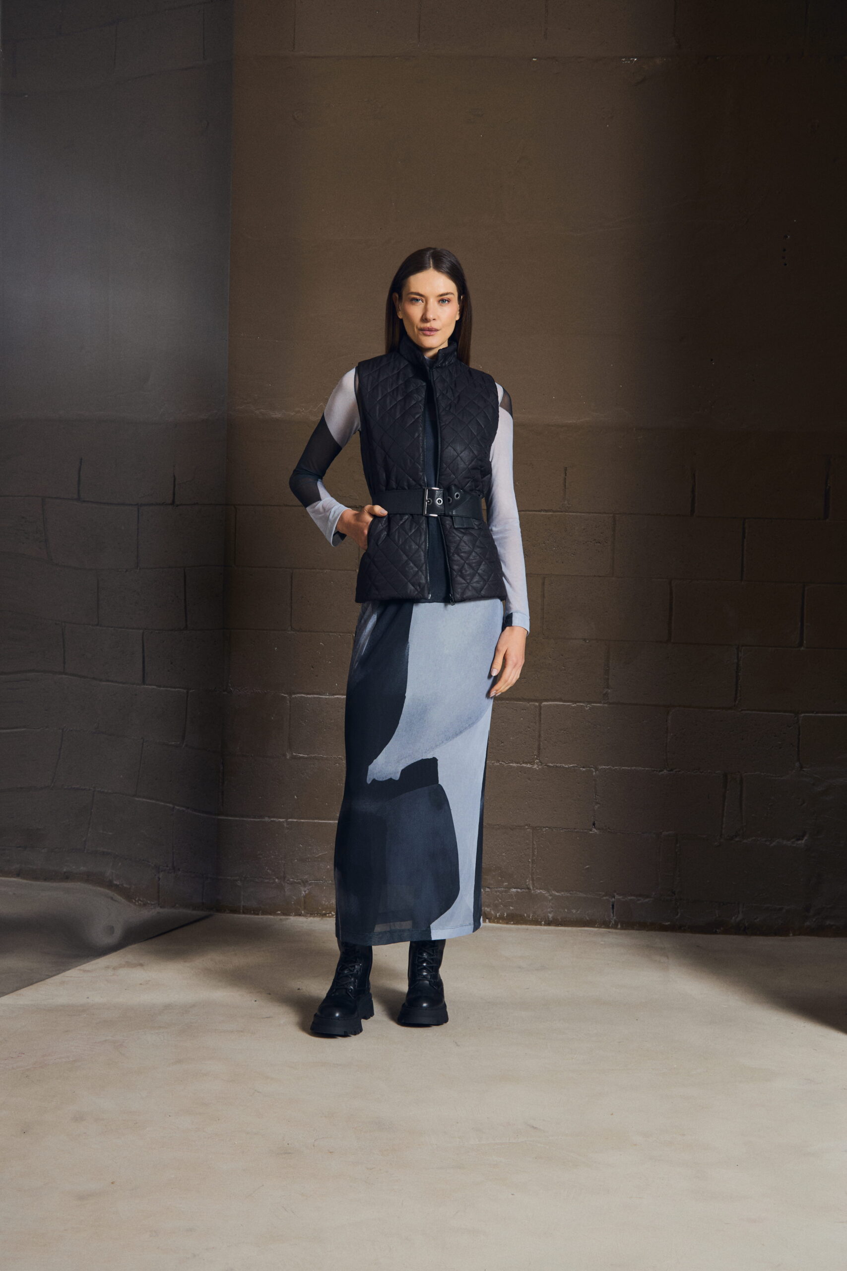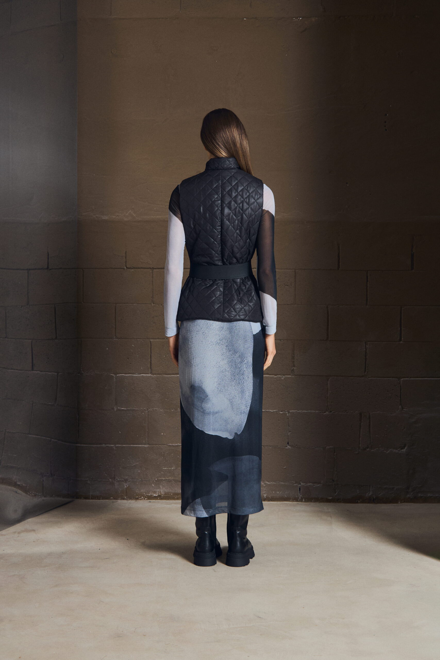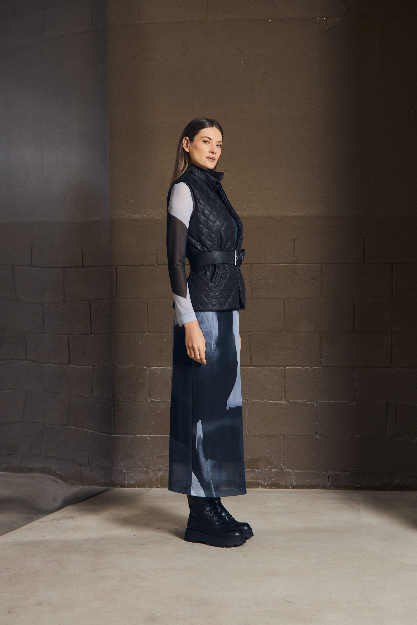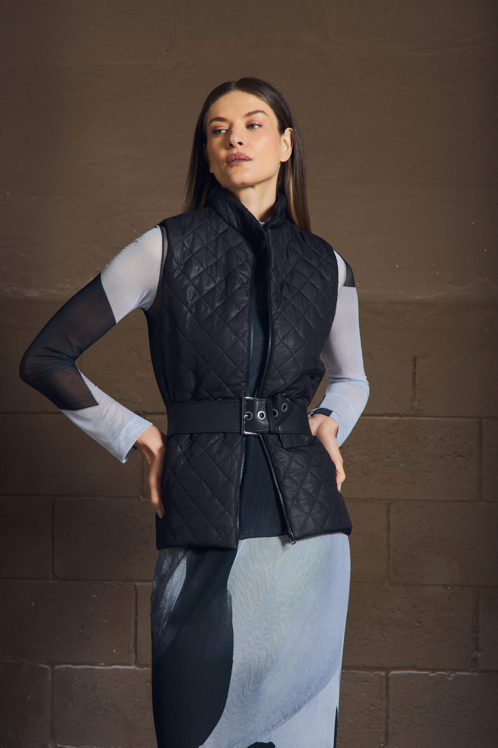 O colete em matelassê traz textura e definição ao look, criando contraste com peças mais leves. Sua construção limpa permite sobreposições elegantes, enquanto o acabamento revela um cuidado silencioso — daqueles que só se percebem ao vestir.