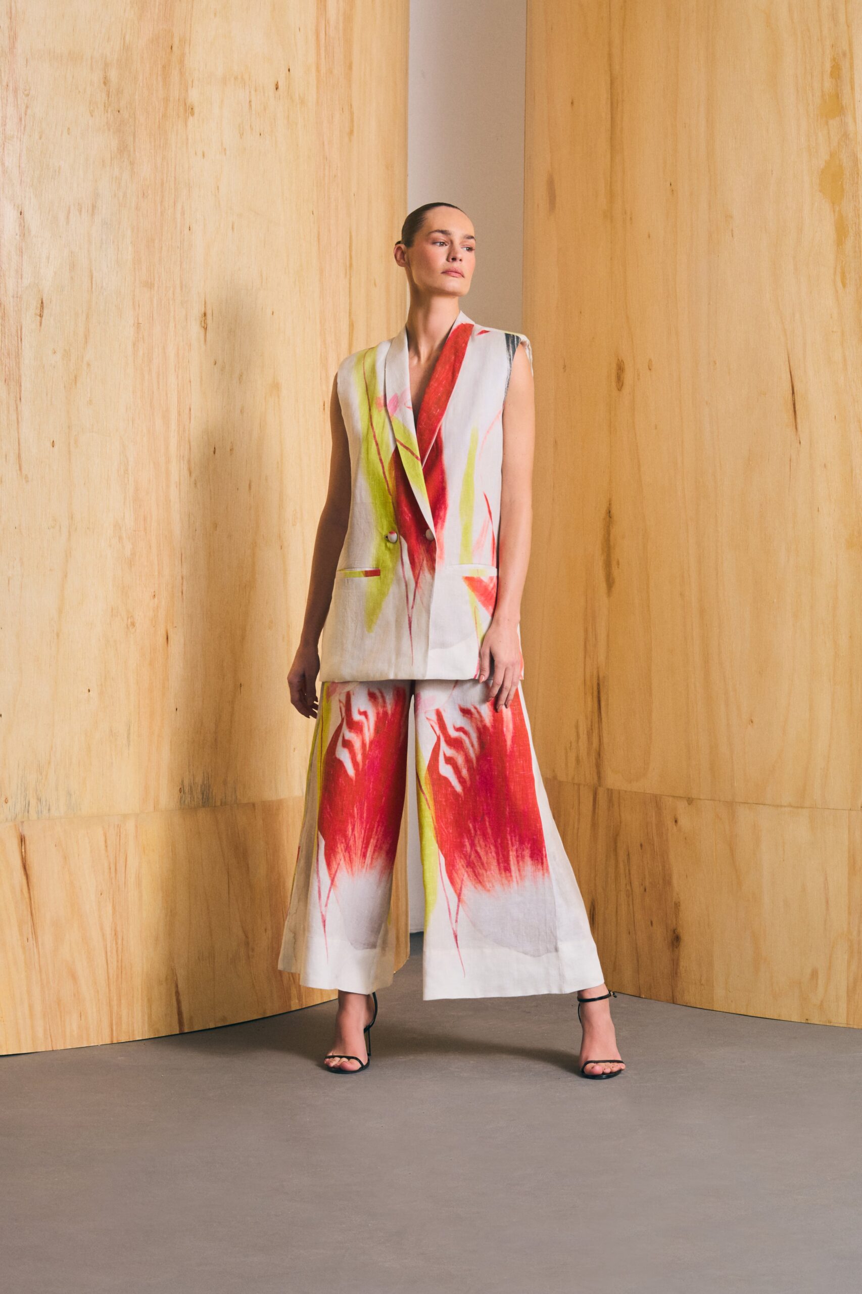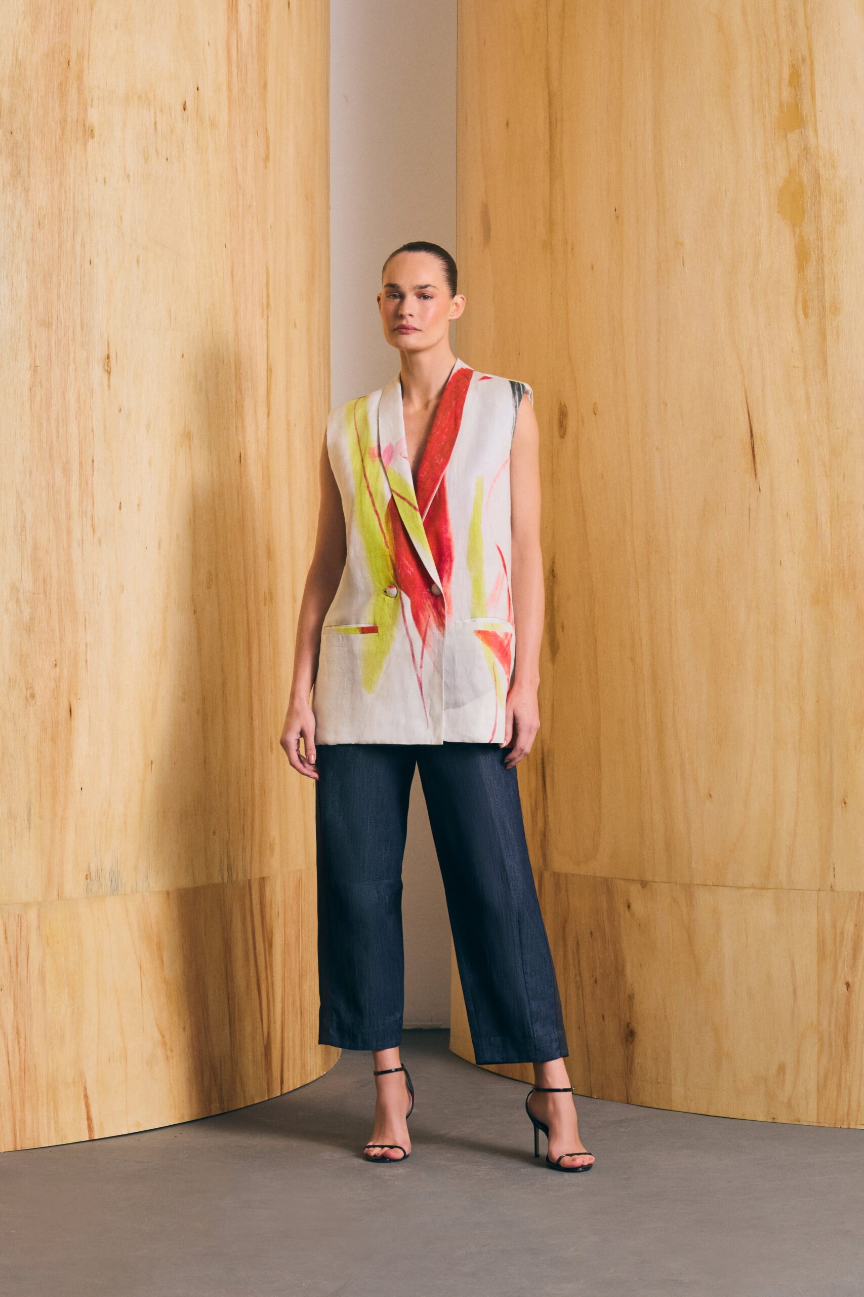 Inspirado na gazânia, flor que floresce em terrenos arenosos e secos, este colete traduz a beleza resiliente da natureza em forma de design. Confeccionado em 100% linho nobre, ele traz leveza e estrutura em equilíbrio, com caimento limpo e linhas retas que conferem um ar moderno e atemporal.
