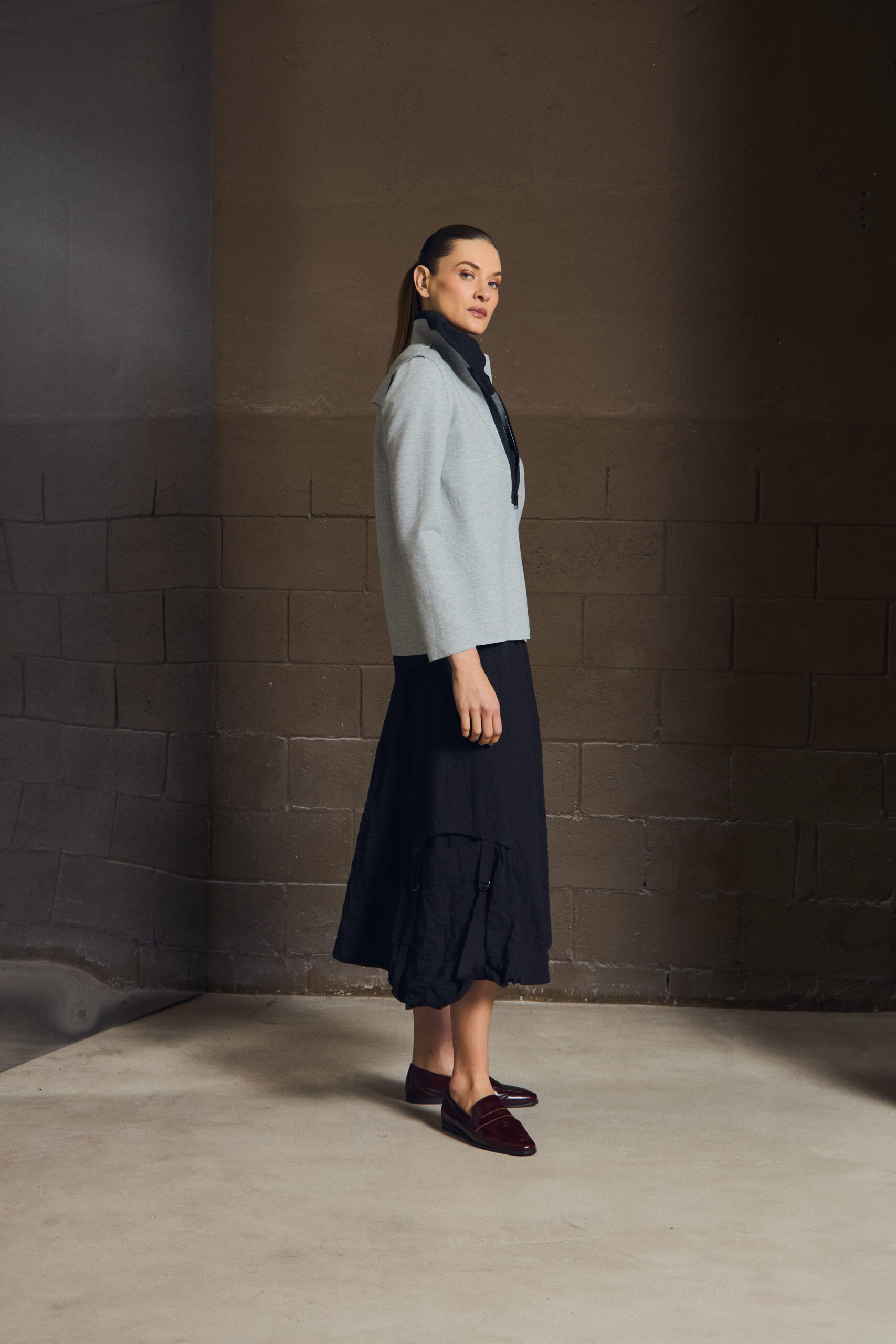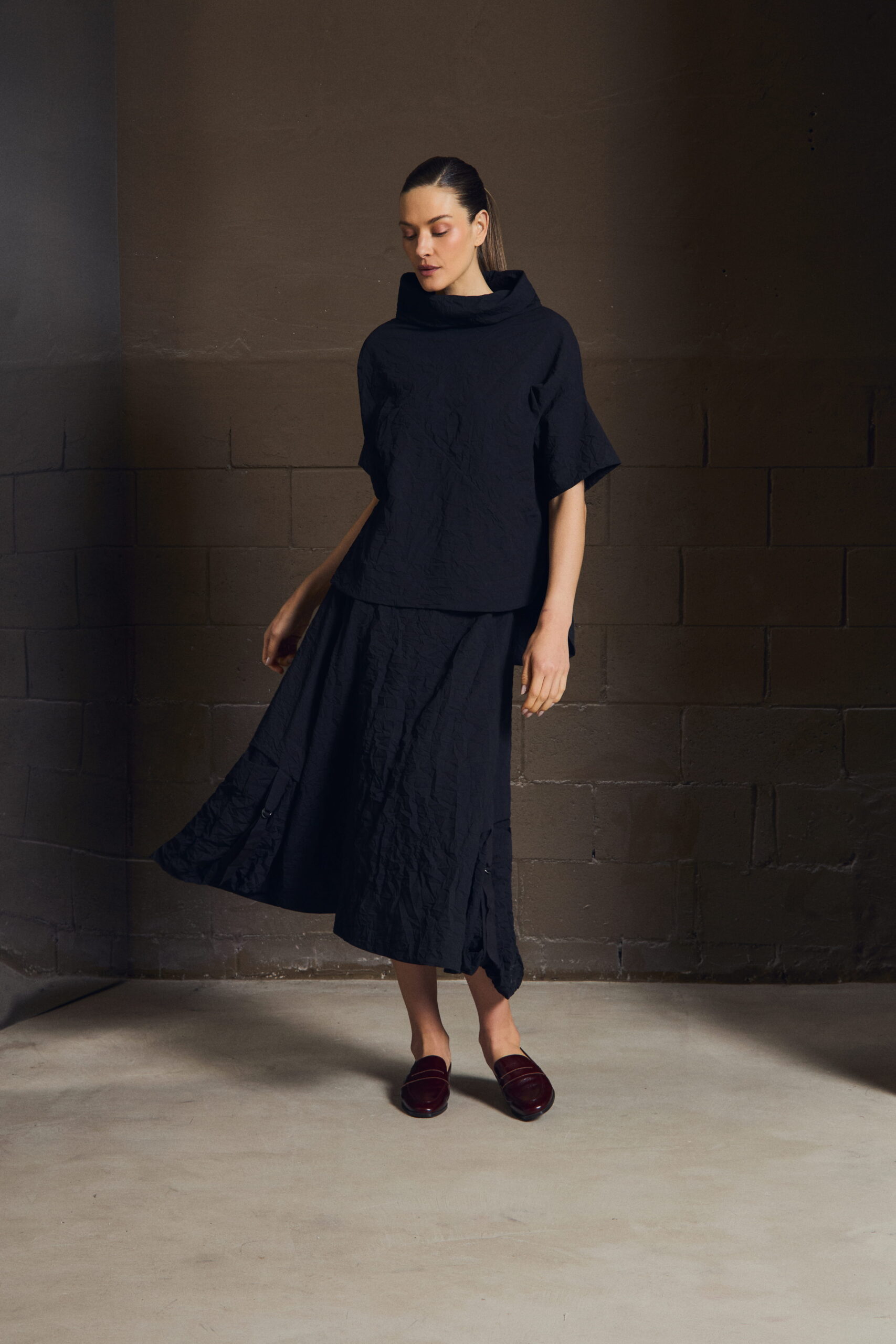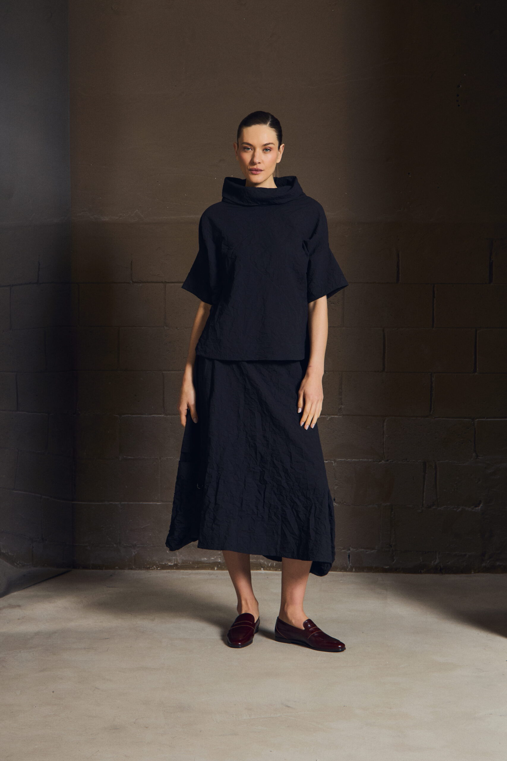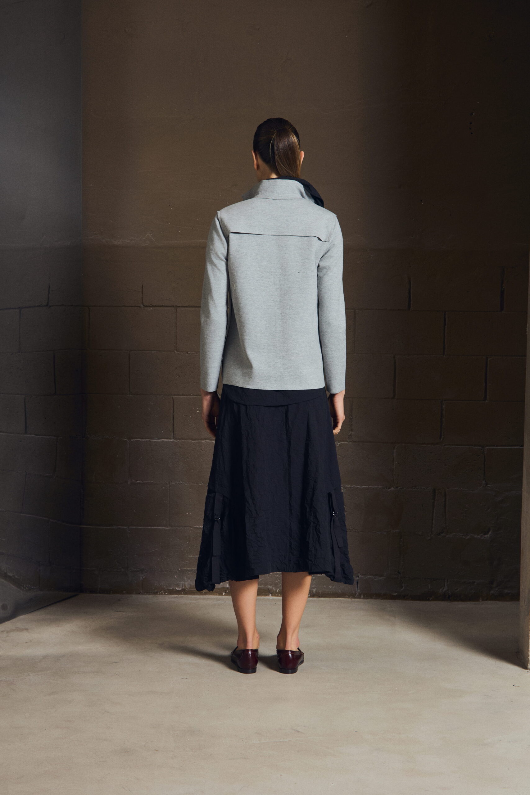 Uma saia que acompanha o corpo sem marcar — leve, precisa, silenciosa.