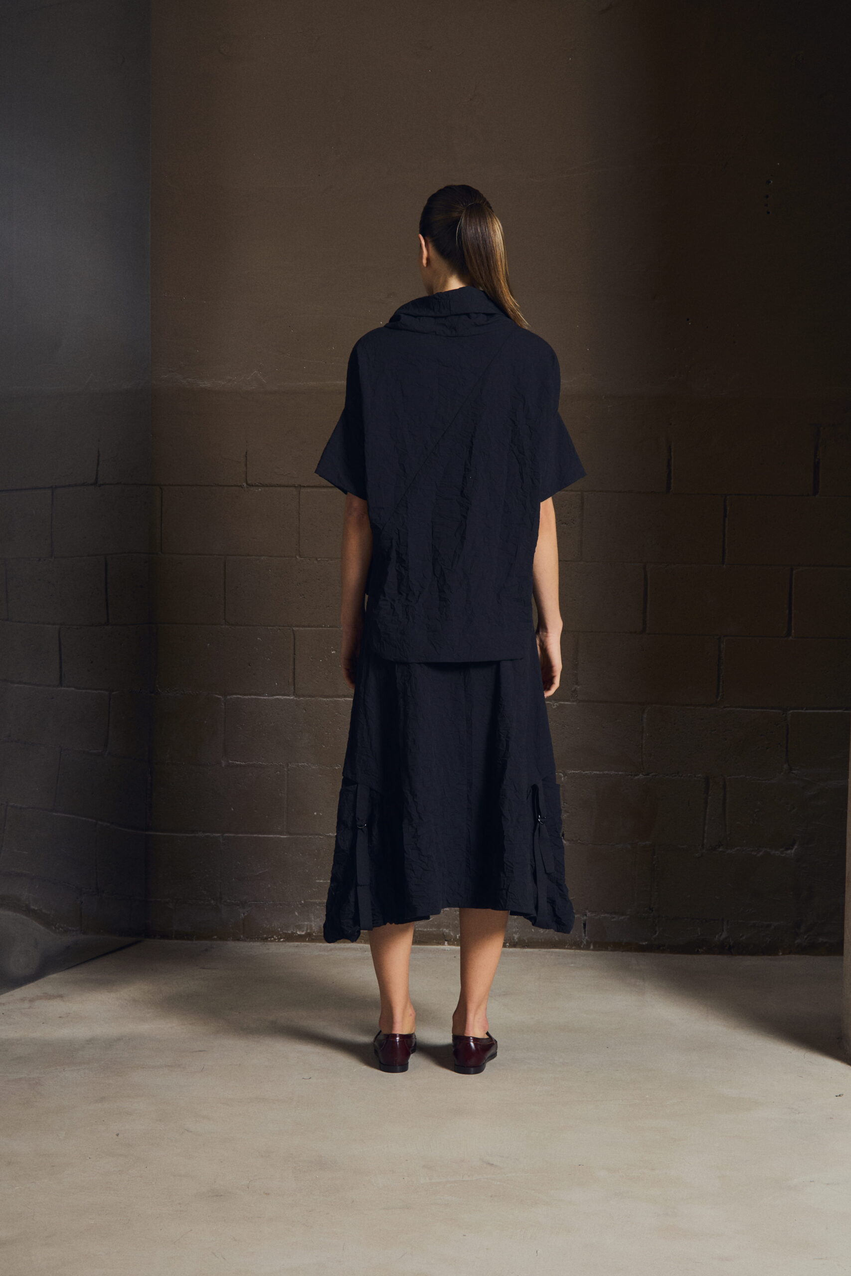 O cotton crush traz textura natural e profundidade, enquanto os bolsos laterais com fita de gorgurão revelam o detalhe inesperado. Essencial, mas nunca óbvia — equilíbrio entre utilidade e elegância com naturalidade.