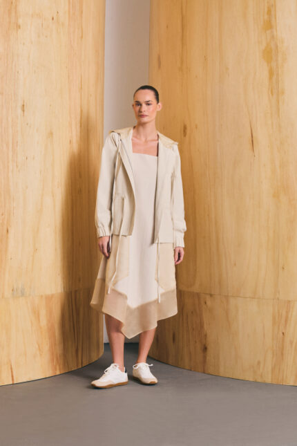 Saia midi com modelagem estruturada e caimento em A. O destaque fica por conta do zíper metálico aparente na parte frontal, que confere um toque moderno à peça. As faixas em organza de seda aplicadas na barra e no bolso frontal criam um jogo de texturas e transparências sutis, elevando o visual com leveza e sofisticação. Ideal para compor produções contemporâneas com personalidade.