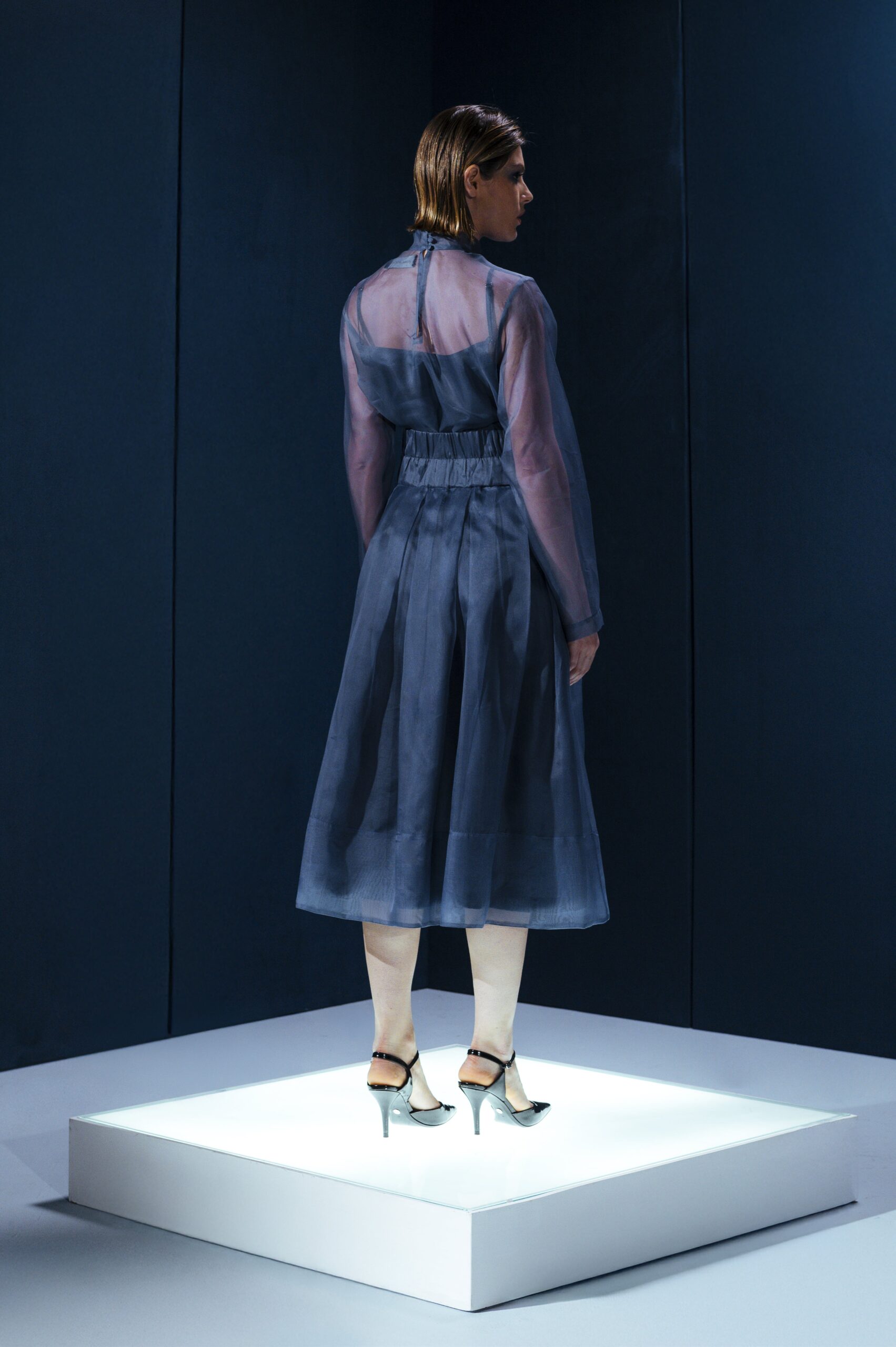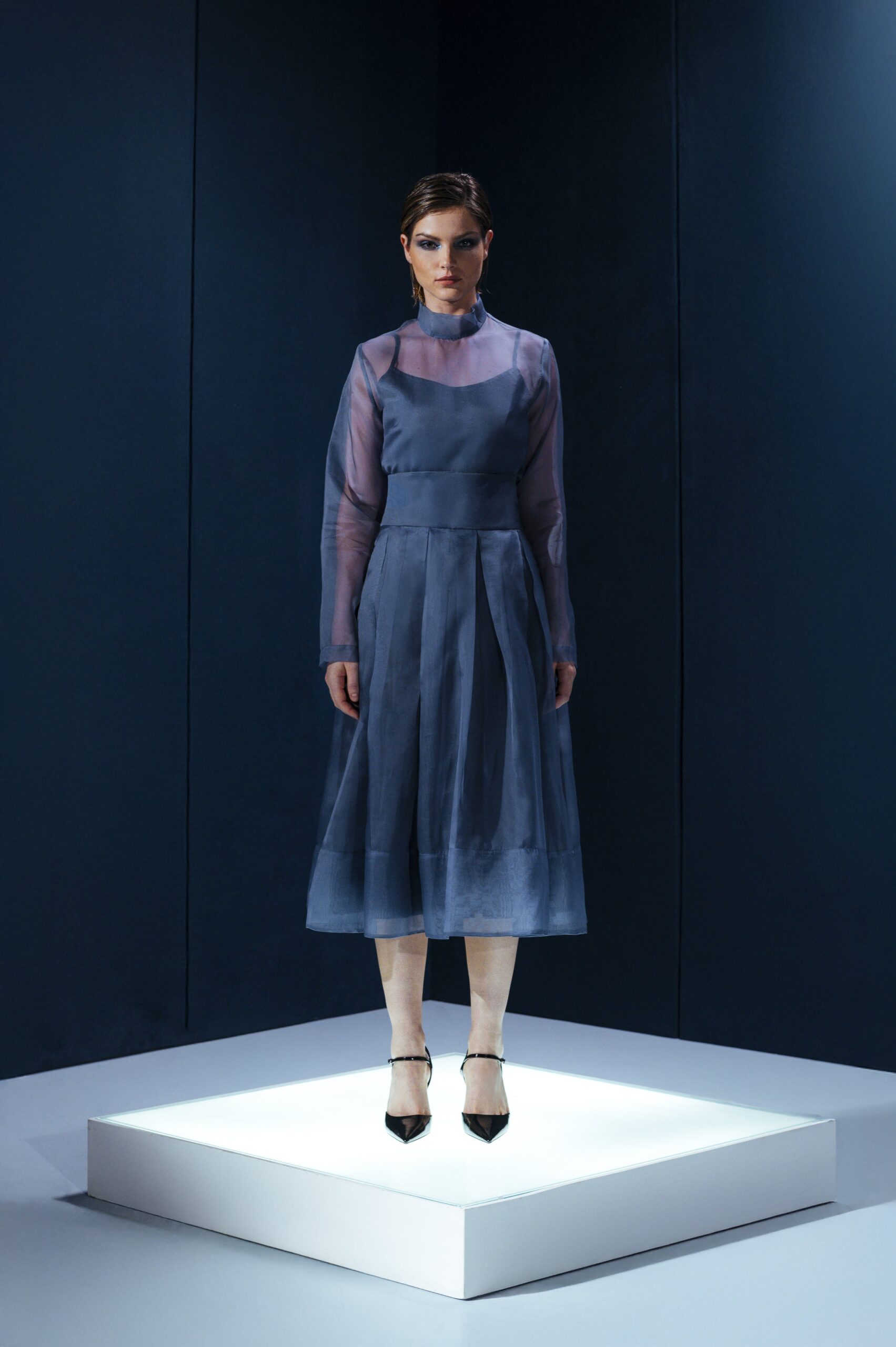 A saia midi em organza de seda é uma peça que valoriza o movimento e a leveza, sem abrir mão da estrutura e da elegância. O tecido translúcido, sofisticado por natureza, ganha modernidade com a estampa exclusiva que brinca com formas e profundidade. Cada passo revela novas nuances, criando um efeito visual impactante.