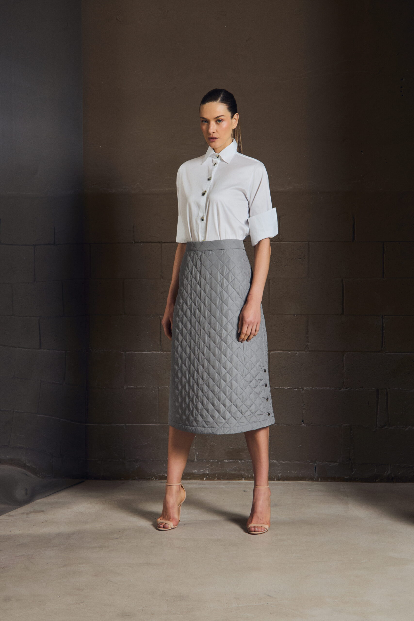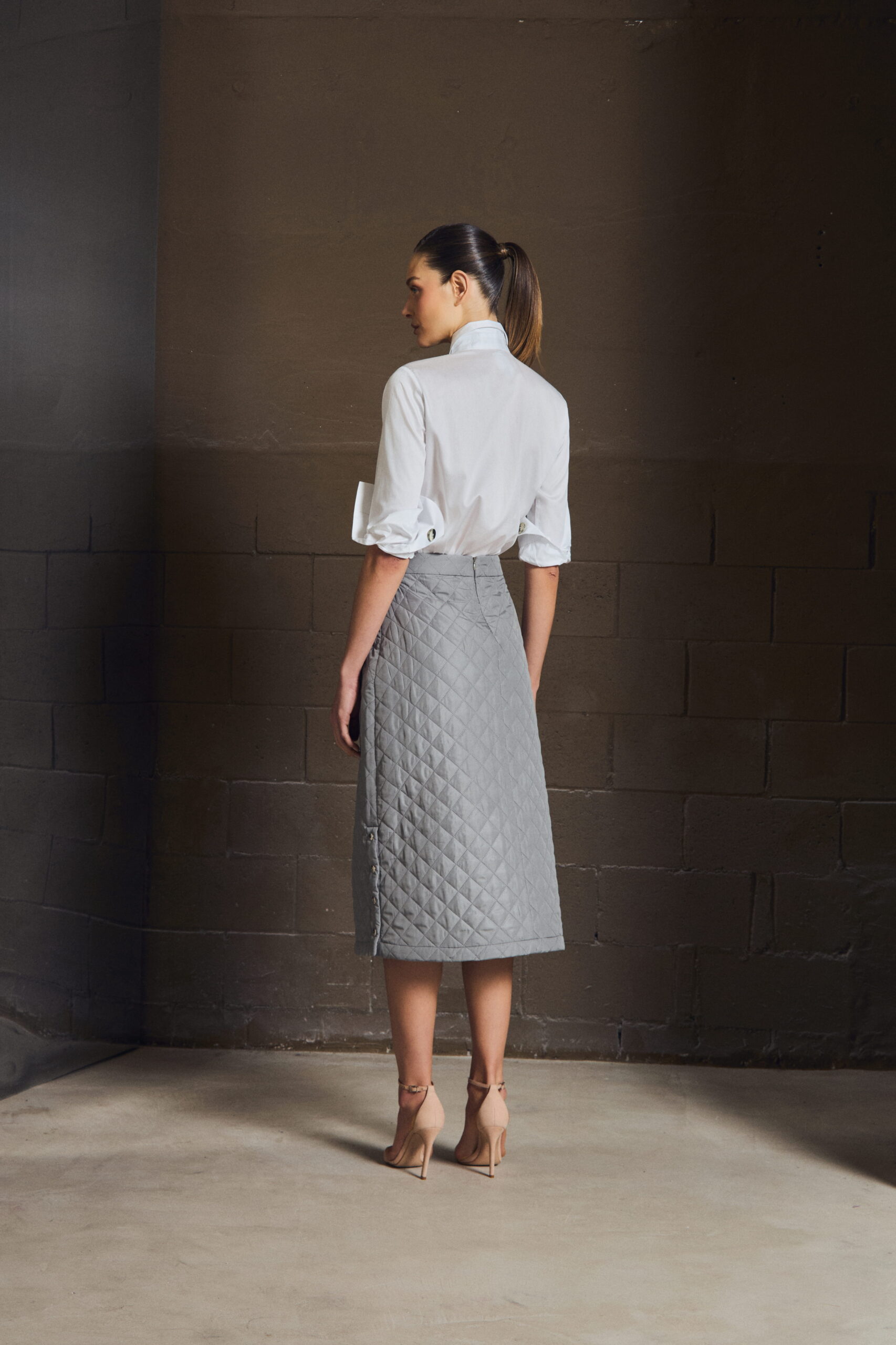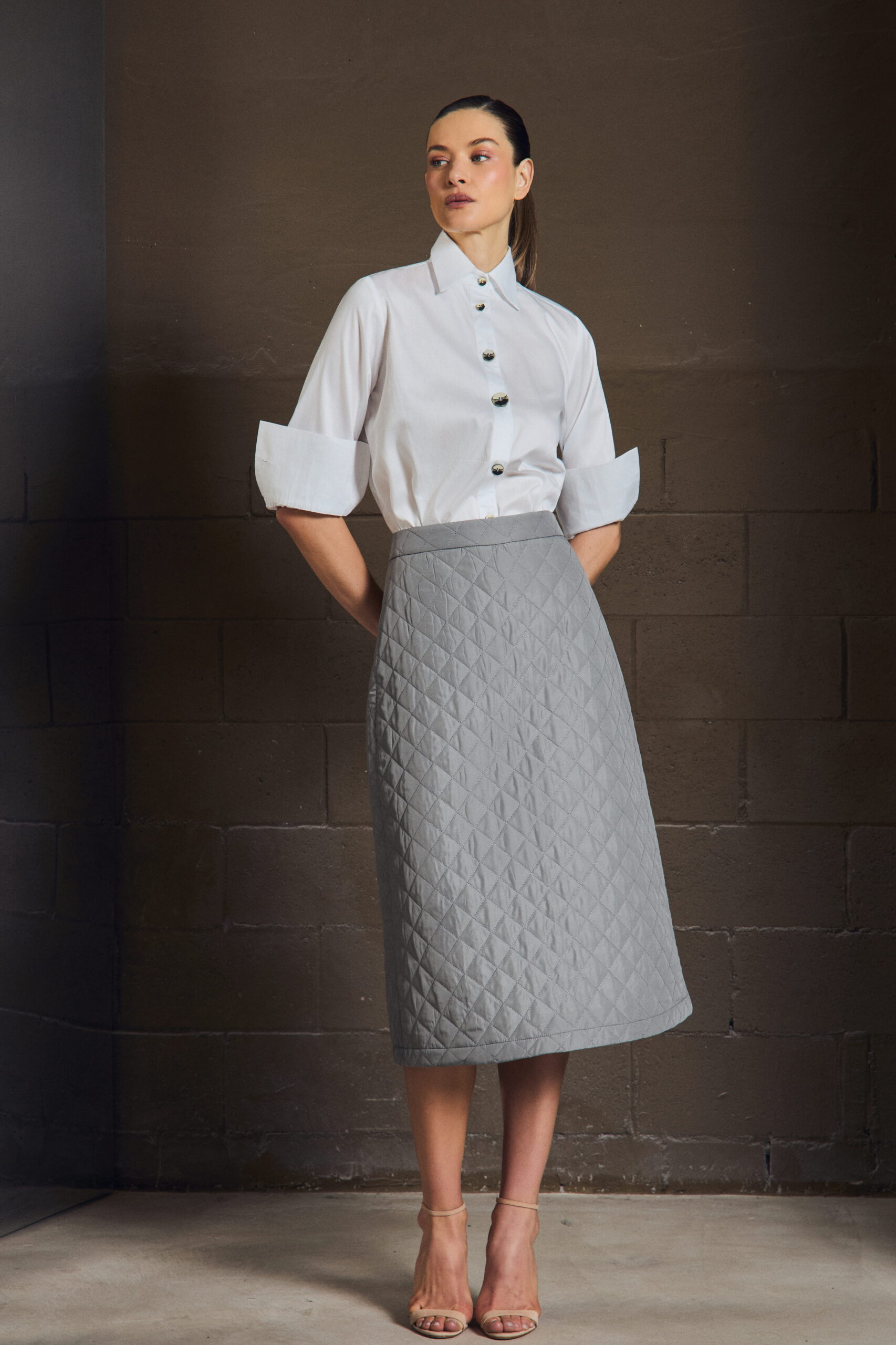 A saia midi em matelassê traduz elegância com precisão. A textura cria profundidade, enquanto a modelagem mantém o gesto minimalista — firme, mas fluido.