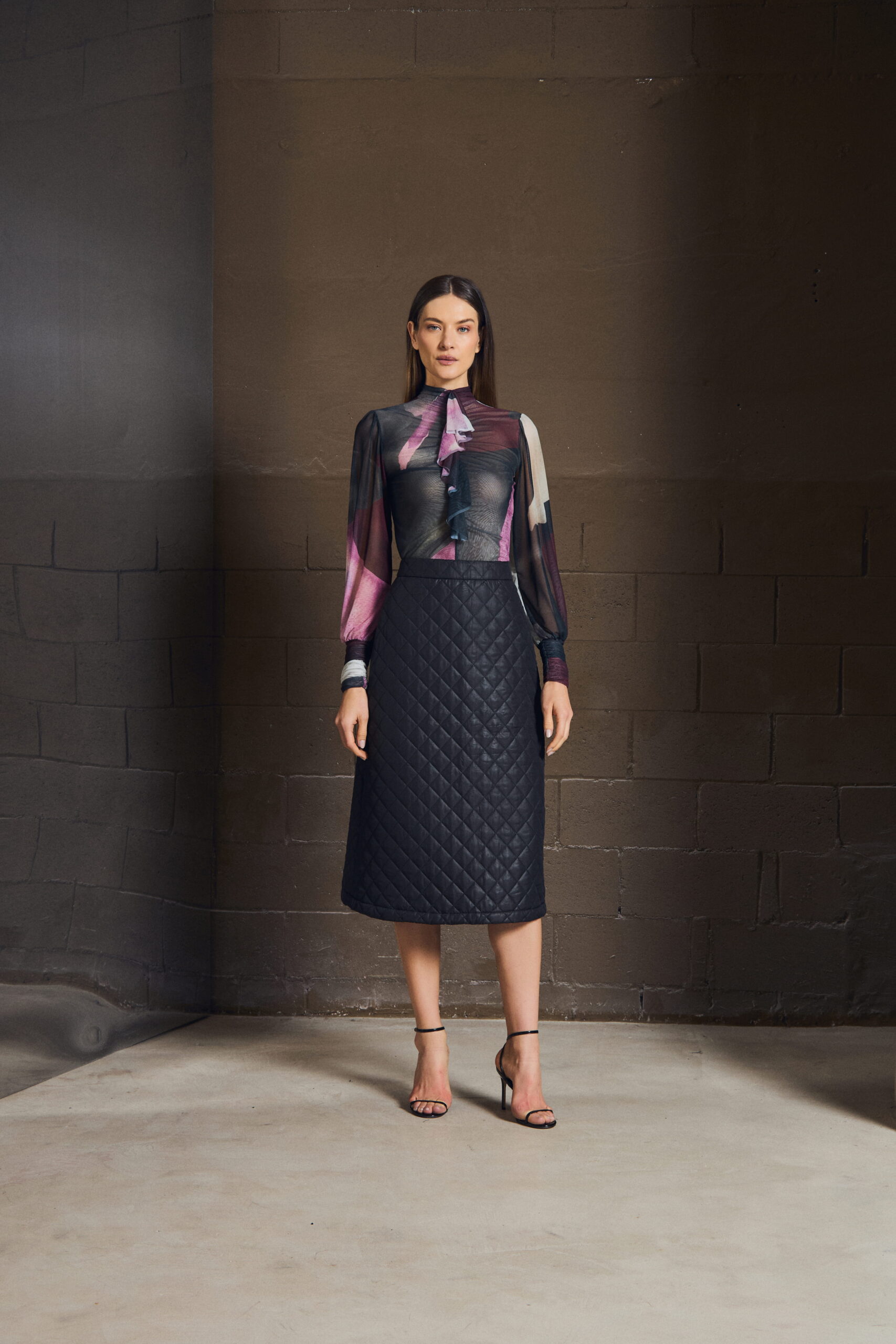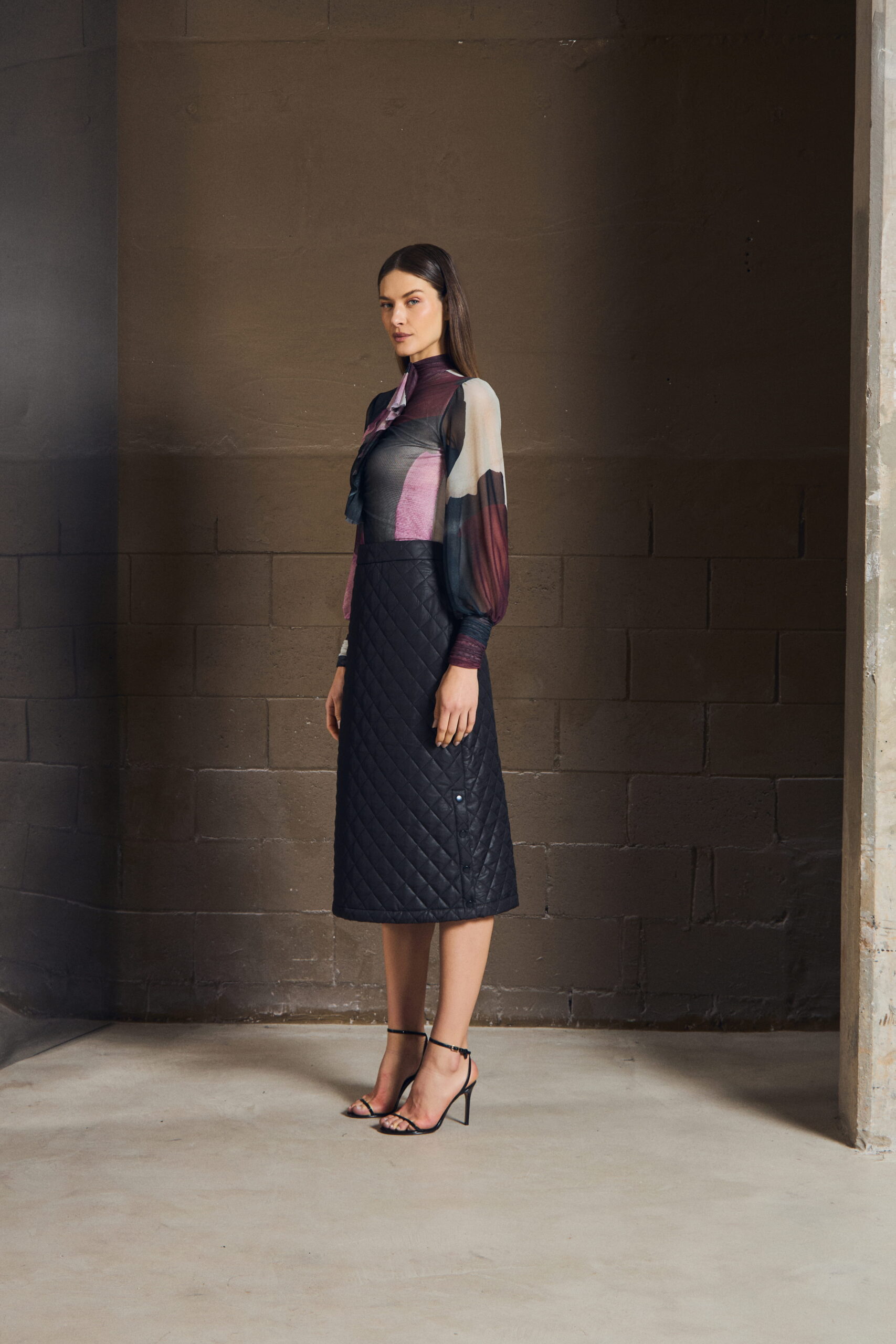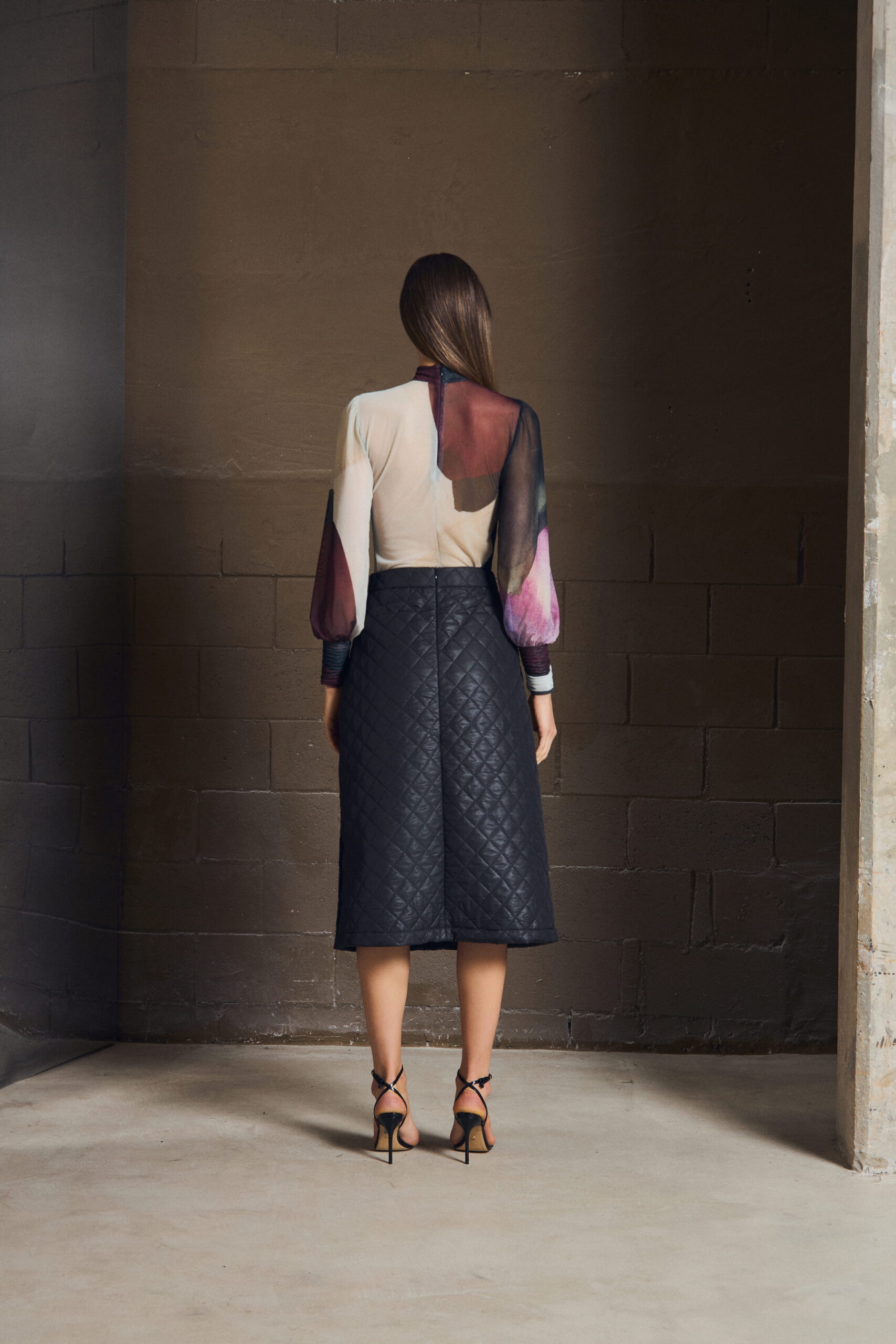 A saia midi em matelassê traduz elegância com precisão. A textura cria profundidade, enquanto a modelagem mantém o gesto minimalista — firme, mas fluido.