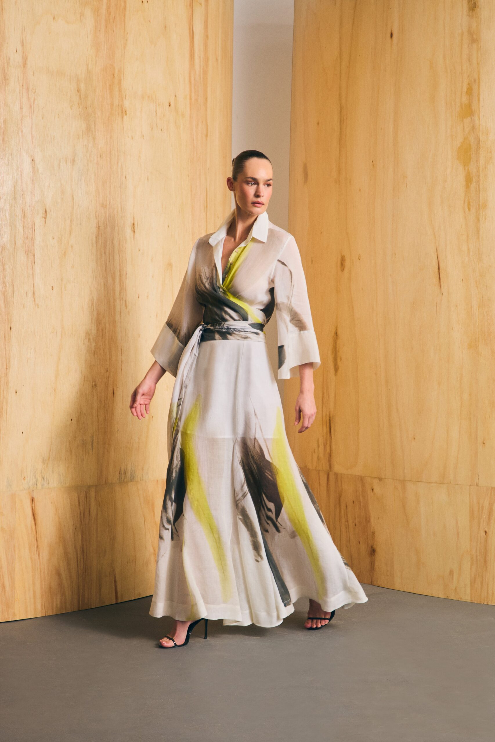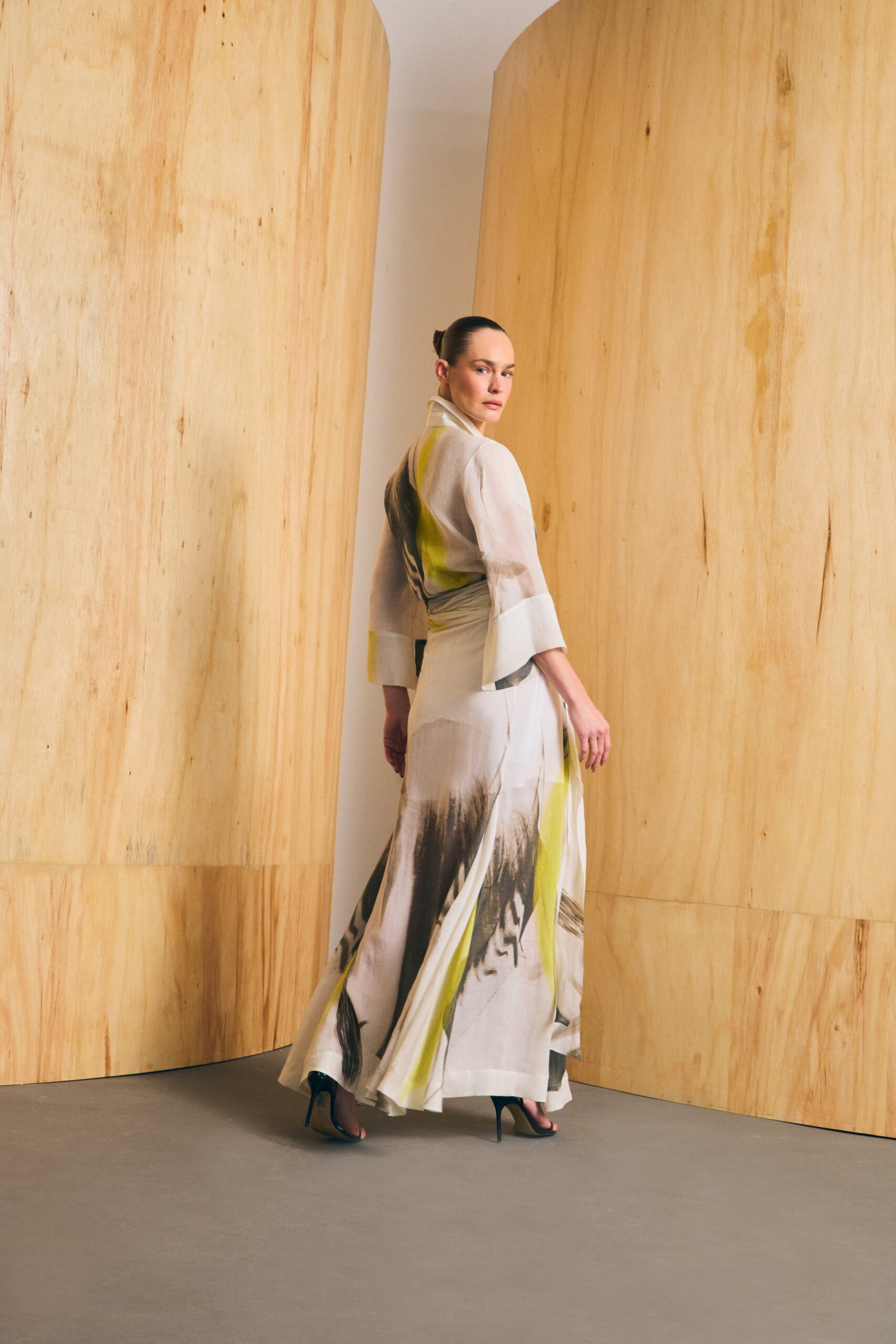 Saia longa confeccionada em organza de linho, com caimento leve e sutil transparência. A saia apresenta nesgas inseridas a partir da altura do joelho, criando movimento sem volume excessivo. A cintura é ajustada e valoriza a silhueta, enquanto a estampa exclusiva Gazânia Noite, desenvolvida no Atelier Aline Rocha, traz identidade à peça. Ideal para produções sofisticadas com frescor e leveza, pode ser usada tanto com camisa estruturada quanto com regatas de verão.