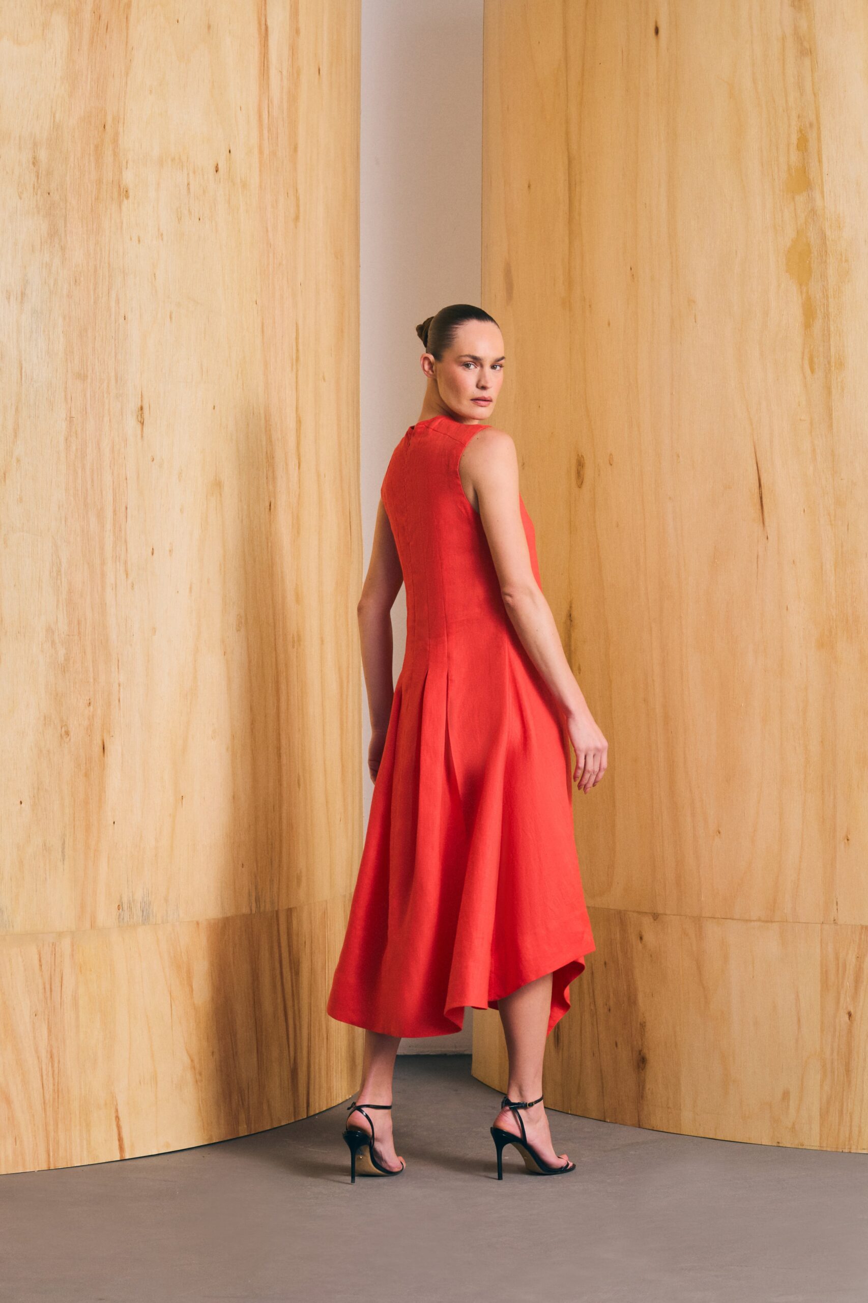 Confeccionado em 100% linho de alta qualidade, este vestido traz um corte impecável que valoriza a estrutura do corpo com elegância e leveza. O modelo sem mangas apresenta recorte central delicado na gola e pregas estruturadas que criam um movimento sutil na saia de comprimento midi irregular.
