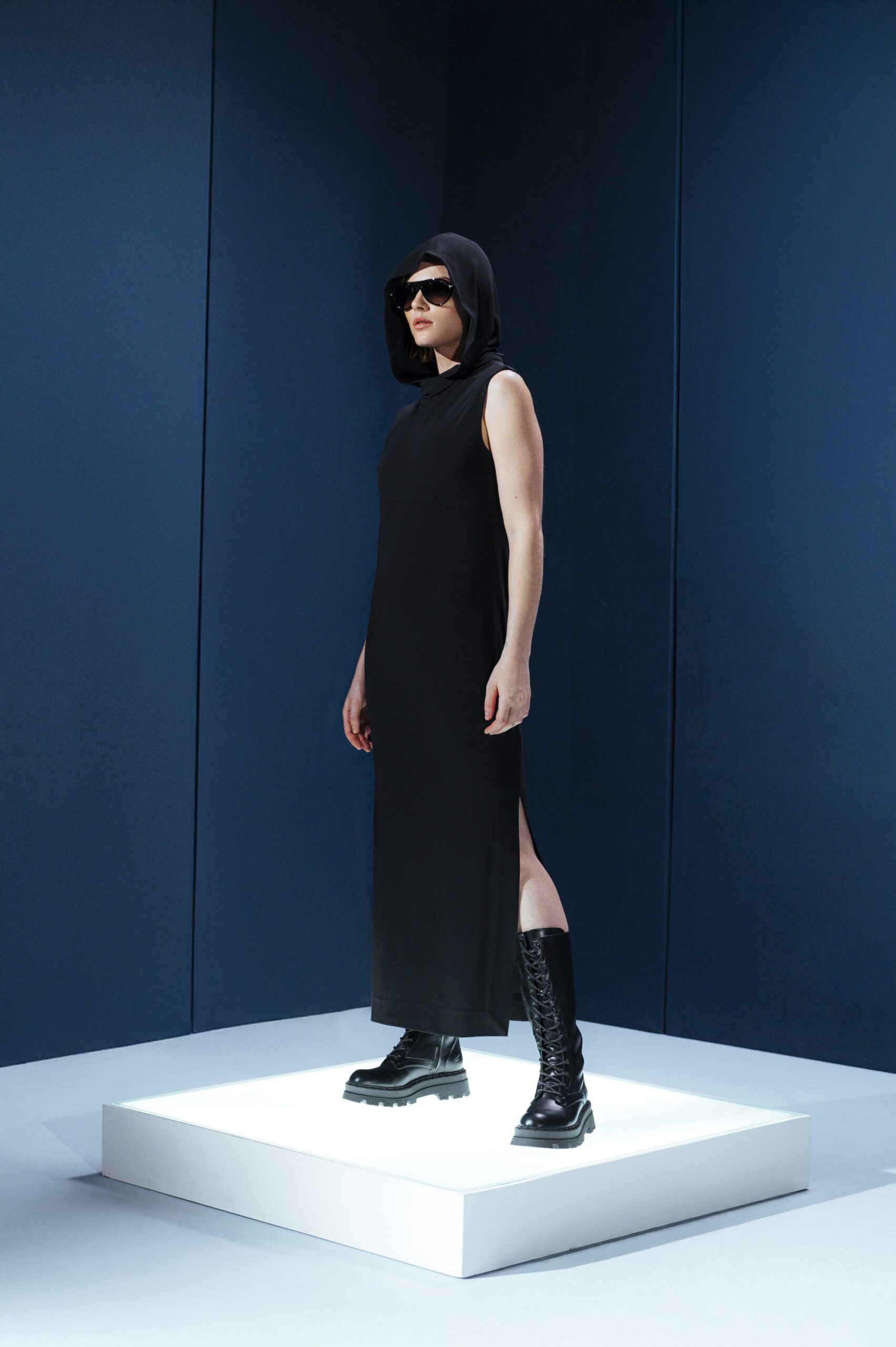 Uma peça que traduz modernidade silenciosa, o vestido longo em jersey preto com capuz é um manifesto de estilo para mulheres que buscam design autoral com conforto. Sua modelagem reta alonga a silhueta sem marcar o corpo, enquanto as duas fendas laterais trazem leveza e movimento à composição.