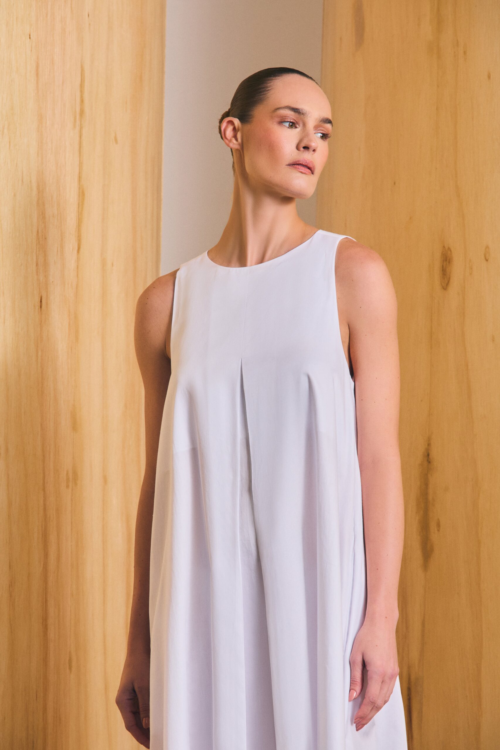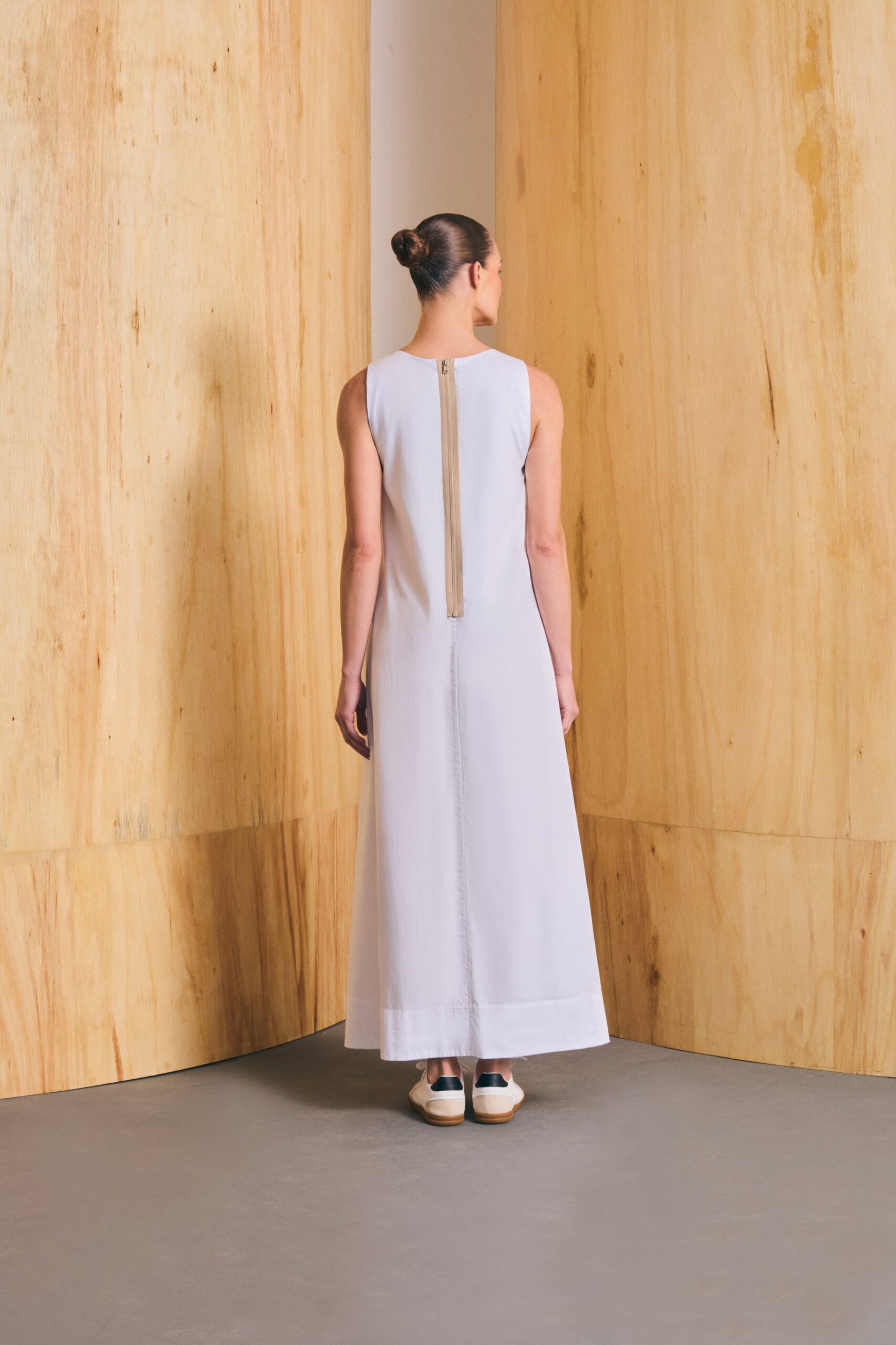 Vestido longo em 100% algodão, com construção limpa e proporções precisas que valorizam o caimento natural do tecido. O modelo apresenta shape reto e fluido, com leve abertura de movimento a partir do corpo, garantindo conforto e elegância sem excesso de volume. O decote é alto e fechado na frente, equilibrado pelas cavas amplas que alongam a silhueta. Nas costas, o vestido possui fechamento por zíper aparente, que acrescenta um detalhe funcional e gráfico ao design. Uma peça versátil, pensada para o uso cotidiano sofisticado, que transita com facilidade entre diferentes ocasiões.